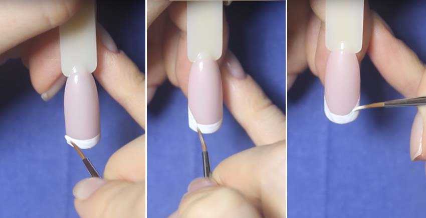 Полоски для французского маникюра клеятся на хорошо просохший базовый лак. Их накладывают таким образом, чтобы отросший край ногтя оставался свободным для предстоящей покраски в белый цвет. После того как и белое покрытие хорошо высохнет, полоски необходимо снять. После завершения, ноготь покрывают прозрачным закрепителем.