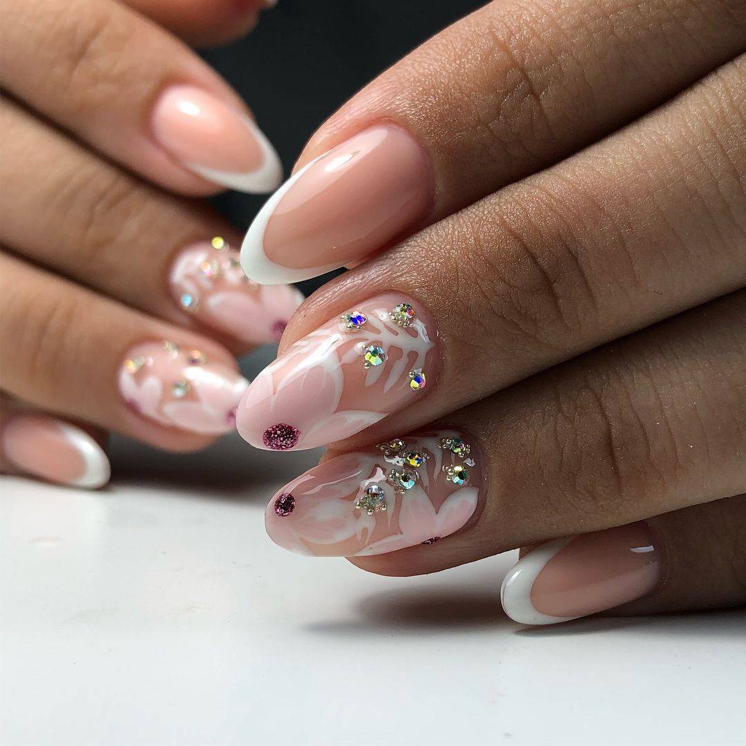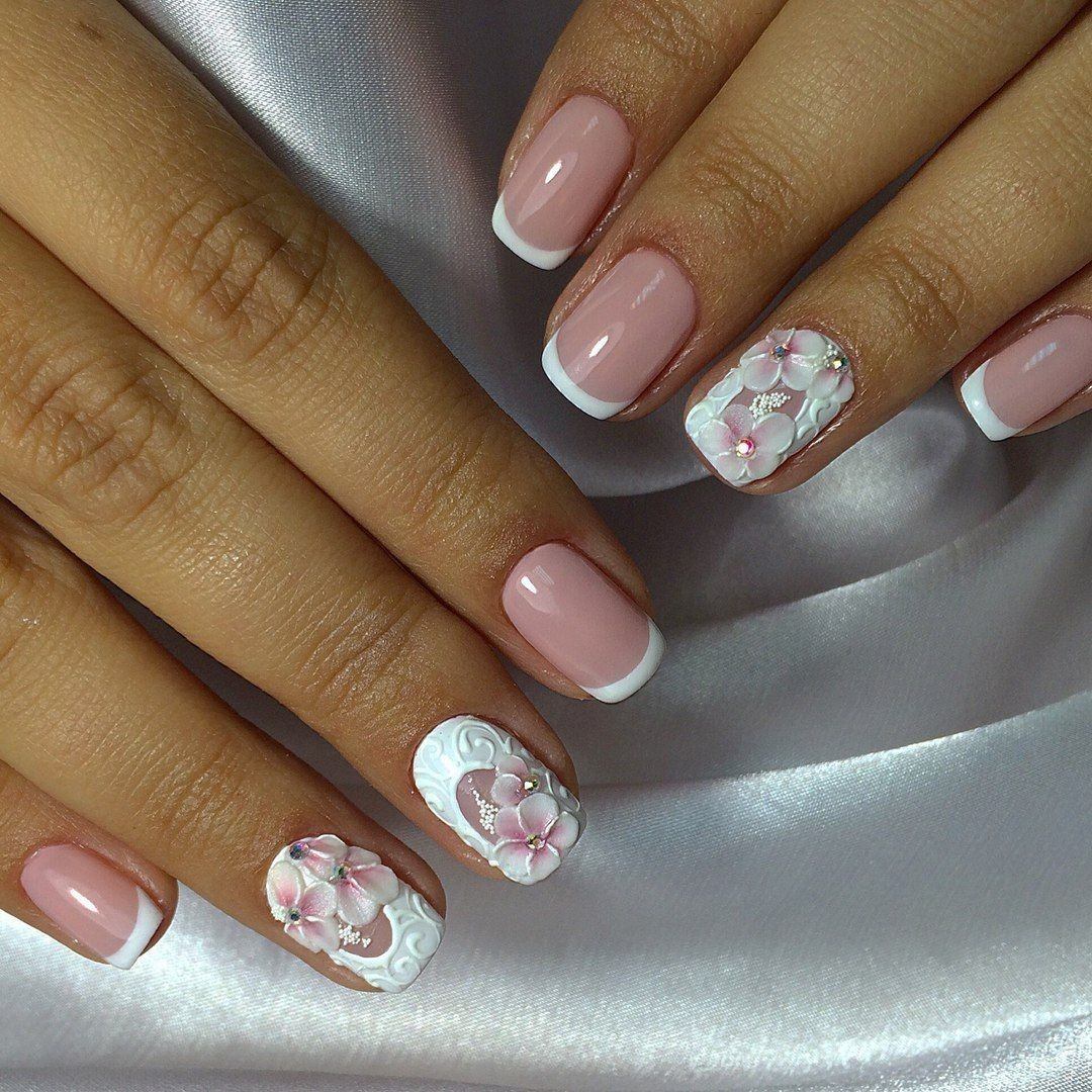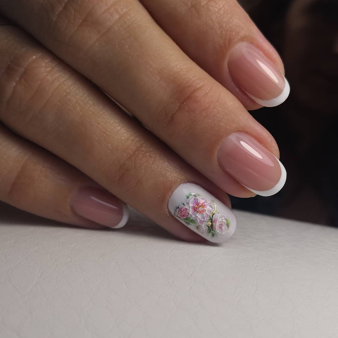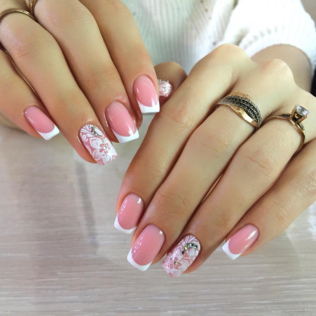 Отлично с французским маникюром сочетаются цветочные мотивы. Они сделаю ноготки очень женственными и утончёнными. Можно рисовать на ноготках как по одному цветочку, так и изображать букетики. Можно выделять отдельные ноготки и рисовать цветочные мотивы. Если вы не блистаете художественными способностями, то воспользуйтесь слайдерами.