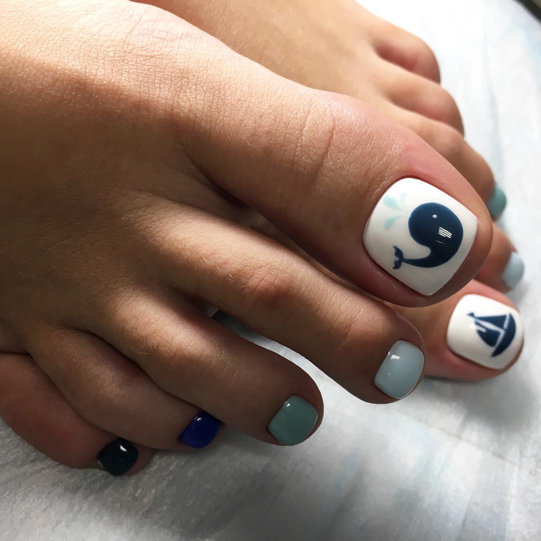 Педикюр 2020, модные тенденции, фото в морской тематике наиболее гармонично выглядят на отдыхе. Также данный дизайн подойдет для тематической вечеринки.