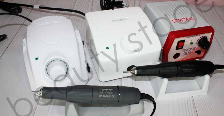Реплики Стронгов хорошего качества, достаточно мощные, они конечно уступают своим подлинникам. Однако, на них можно обучится полноценной работе. Минусы, они не выдержат потока и увы, быстро умрут. Да и для педикюра слабоваты, не больше 2-3 процедур в неделю.
