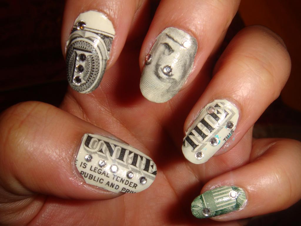 Разновидностью газетного дизайна считается маникюр с отпечатком элементов долларовой купюры. Естественно, для этого используется не настоящие деньги, а обычные подделки купюр, продающиеся в отделах канцелярии. Такой вариант маникюра имеет свою историю. Хип-хоп певица Лил Ким вместе с известным звездным стилистом Бернадеттом Томсоном для съемок одного из своих клипов украсила свои ноготки экстравагантным маникюром в виде настоящих долларов. Это принесло ее песне и клипу ошеломляющий успех, а ноготки певицы, украшенные деньгами, не обошлись без внимания поклонников и стали очень модными.