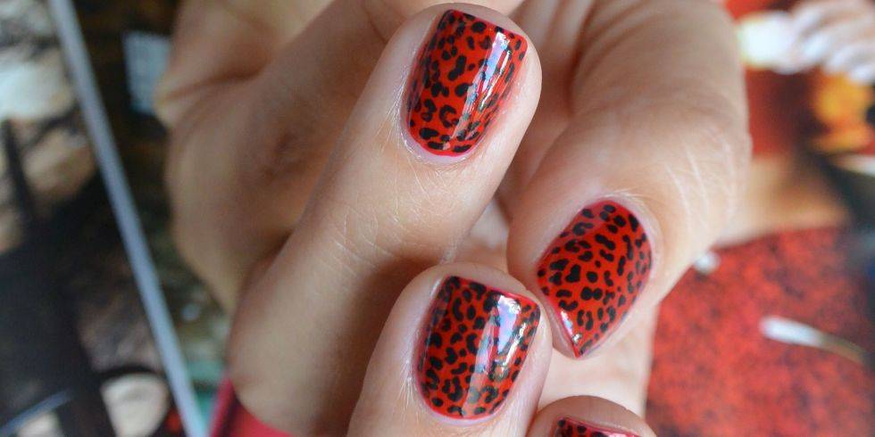 Один из модных вариантов красного маникюра – это имитация пятен шкуры леопарда. Такой дизайн подчеркнет независимый и страстный характер девушки. Сделать маникюр просто, понадобится тонкая кисточка.