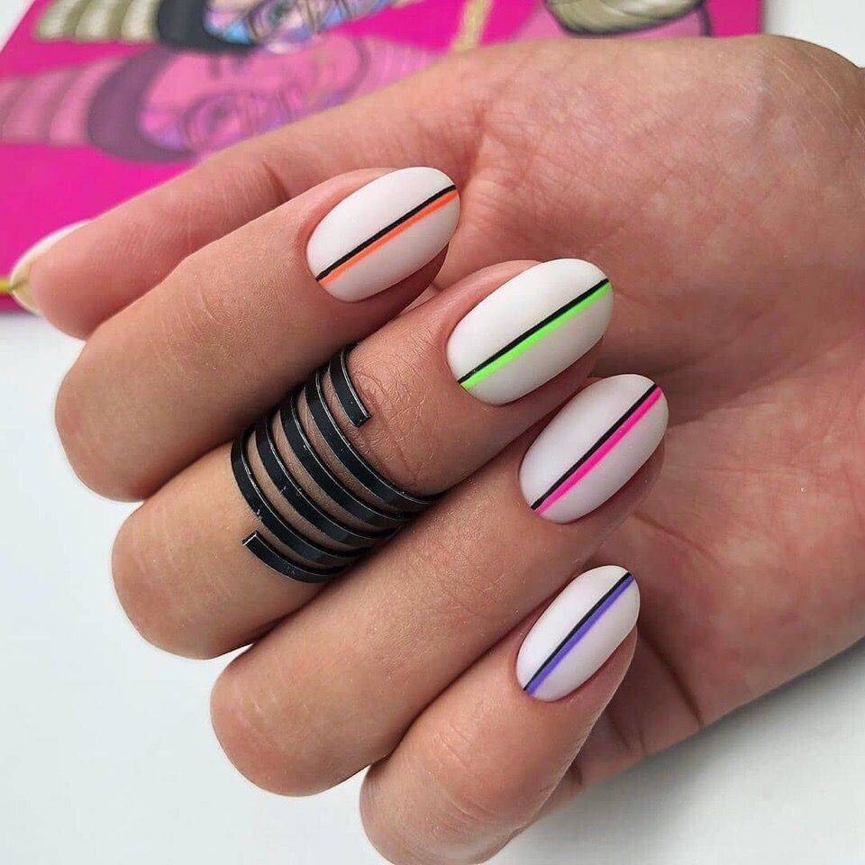 - Вертикальные полосы – прорисовываются белым или чёрным цветом. Пространство между ними закрашивается разными гель-лаками, создаётся сочетание разноцветных полос. В зависимости от выбранной цветовой гаммы можно получить маникюров разном стиле – от нежного пастельного до летнего в соединении неоновых полос.