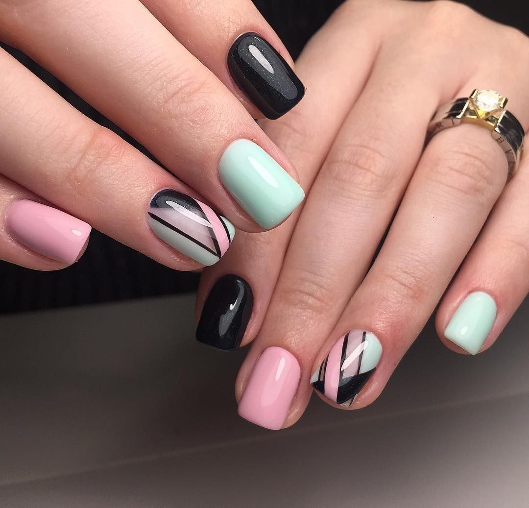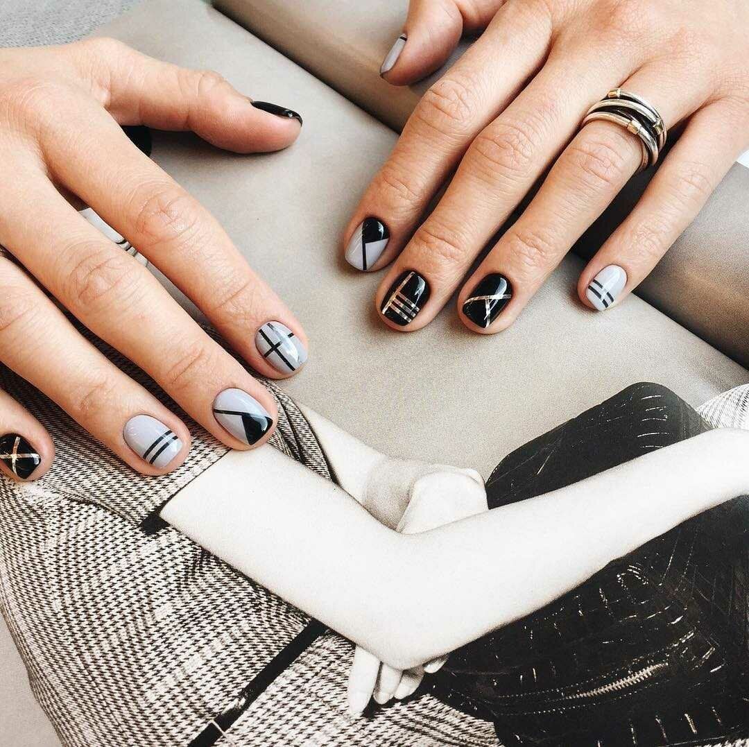 Короткие ногти – отличный вариант для геометрии. В 2021-2022 их обладательницы с удовольствием выбирают яркие цвета и смелые дизайны, один из которых – окрашивание одного ногтя матовым черным цветом, другого – малиновым, третьего – персиковым с добавлением вертикальных полос черного цвета, каждая из которых отличается шириной, четвертого – мозаикой из вышеперечисленных цветов.