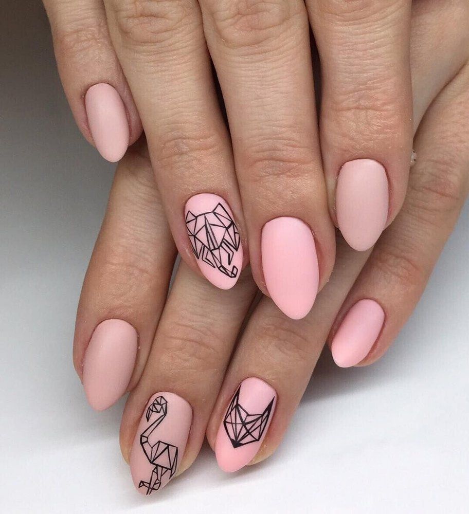 В качестве основы обычно берется статичный цвет — черный, нюдовый, серый. Геометрия применяется к ногтю — кошке, волку, колибри, сове и т.д. Все они выполнены с четкими линиями. Может понадобиться инструмент: трафарет или слайдер.