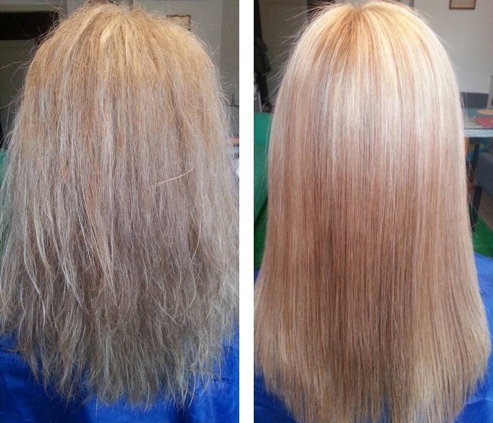- первый шаг – мытье головы и подсушивание волос (при максимальных повреждениях кутикулы используют несмываемый спецуход);
