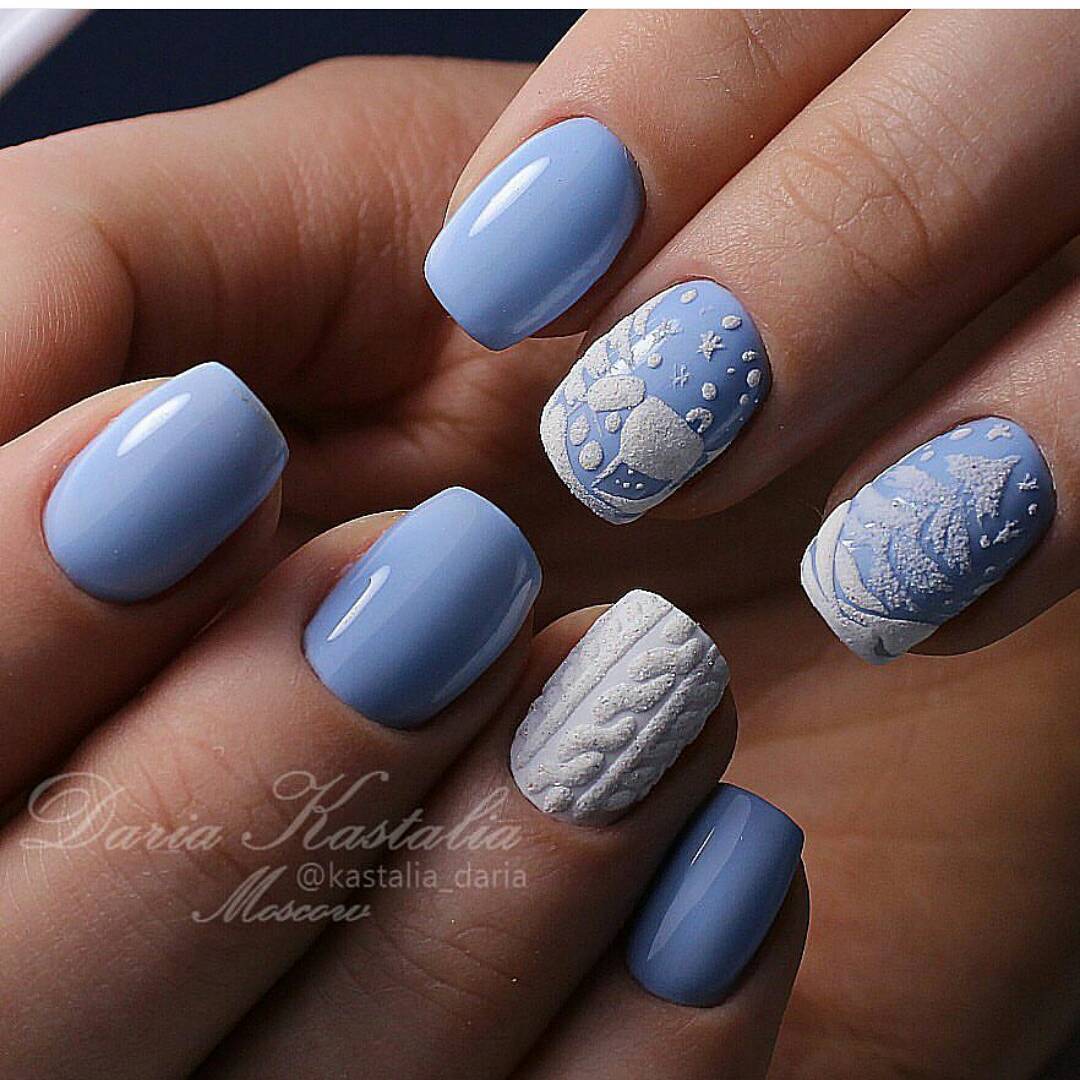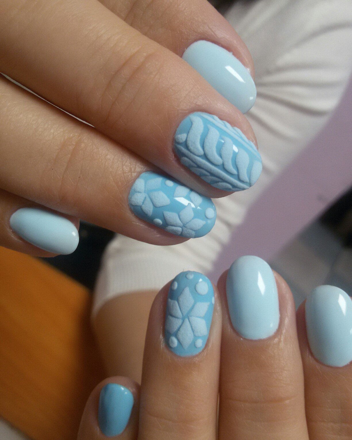 Для начала покройте ногти лаком светлого голубого оттенка, потом нанесите на него прозрачным топом вязаный узор или витиеватые ажурные рисунки. Сверху лак обильно посыпьте акриловым песком, излишки смахните кисточкой. Взгляните на фото-примеры маникюра, в них невозможно не влюбиться.