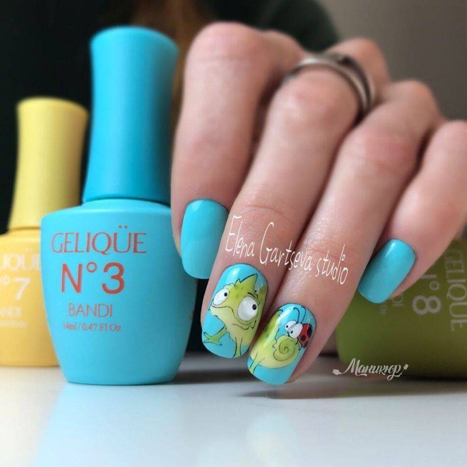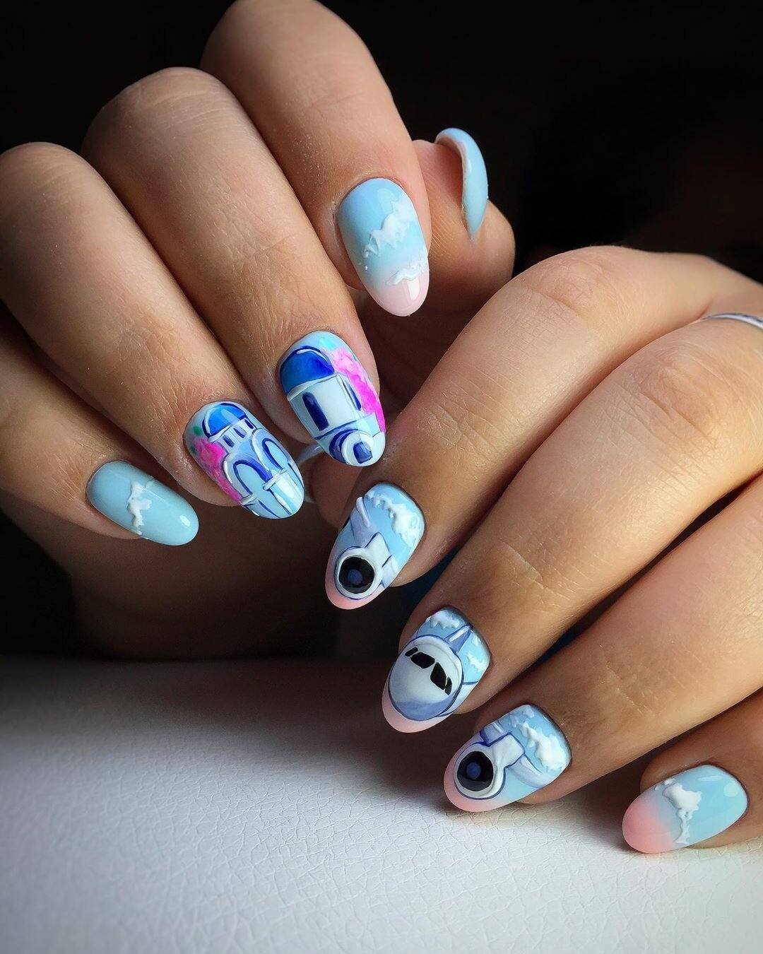 Сочетание голубого маникюра с рисунками, как и многие другие варианты оформления, будет всегда смотреться эффектно и привлекательно. И в этом случае дамам предоставлена прекрасная возможность проявить фантазию и создать свой собственный, не похожий на другие нейл-арт. Голубая палитра чудесно уживается на ногтевых пластинах с изображениями и узорами на разную тематику, поэтому вы можете отдать предпочтение нейтральным рисункам или остановить выбор на чём-то особенном.