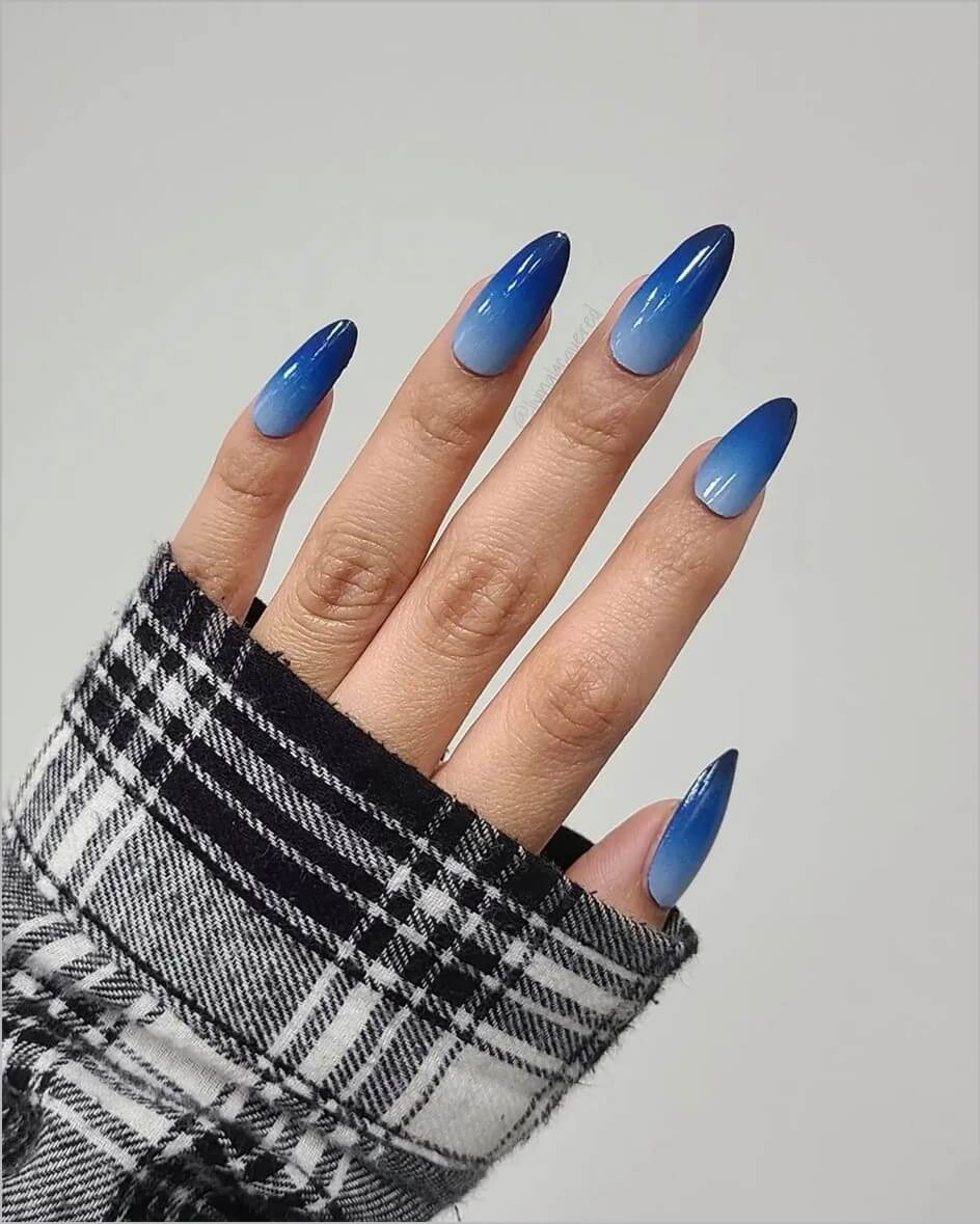 На коротких ногтях отлично смотрится синий маникюр градиент. Можно уйти в сторону затемнения, сочетая яркий синий с черным лаком. Градиент выполняется кистью, губкой, аэрографом, смотря в чем ты достигла наибольшего мастерства. Техника предполагает, что при работе кистью мы тянем светлый цвет на темный, а значит руки клиентки во время работы необходимо будет держать в таком положении, чтобы удобно было двигаться кистью сверху вниз. Для новичков подойдет вариант с губкой, когда необходимо нанести на неё три полоски, где средняя – это уже готовая смесь двух сочетающихся тонов. Далее необходимо аккуратно нанести несколько слоев и закрепить топом.