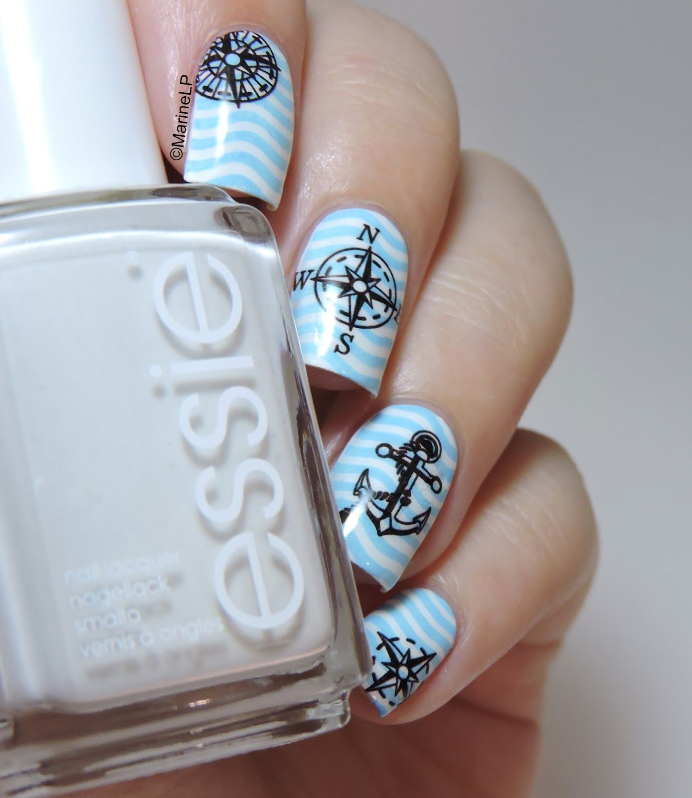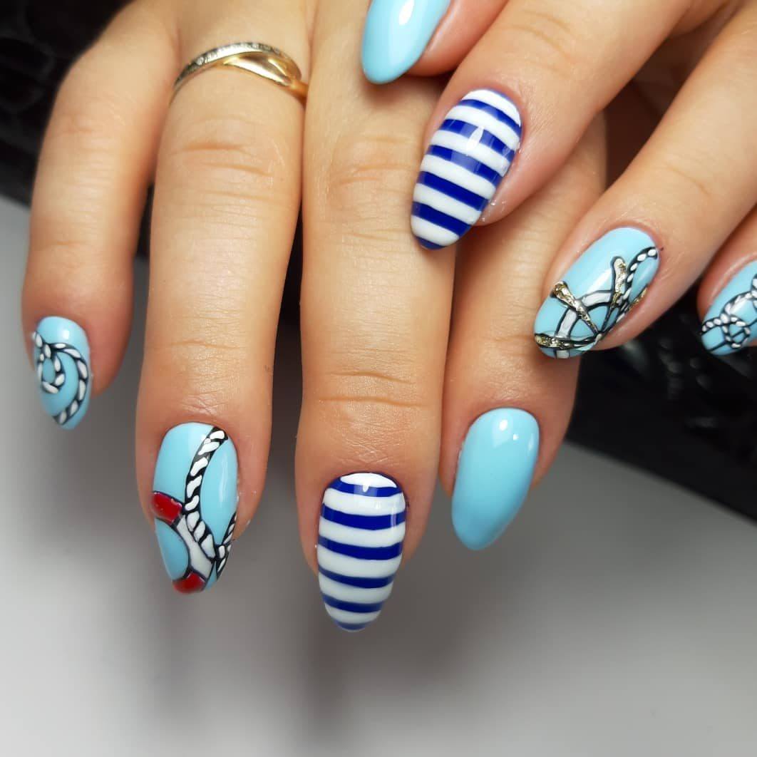 Маникюр в синих тонах — это, конечно, морская тематика. Ни один летний сезон не проходит без морских каникул. Настроение создаст графический полосатый маникюр в стиле «тельняшка». Белый, синий и золото – просто, лаконично и нарядно. Забери идею для летнего отпуска. Подбери тематический декор – якорь, рыбки, морские звезды, жемчуг и кораблики.