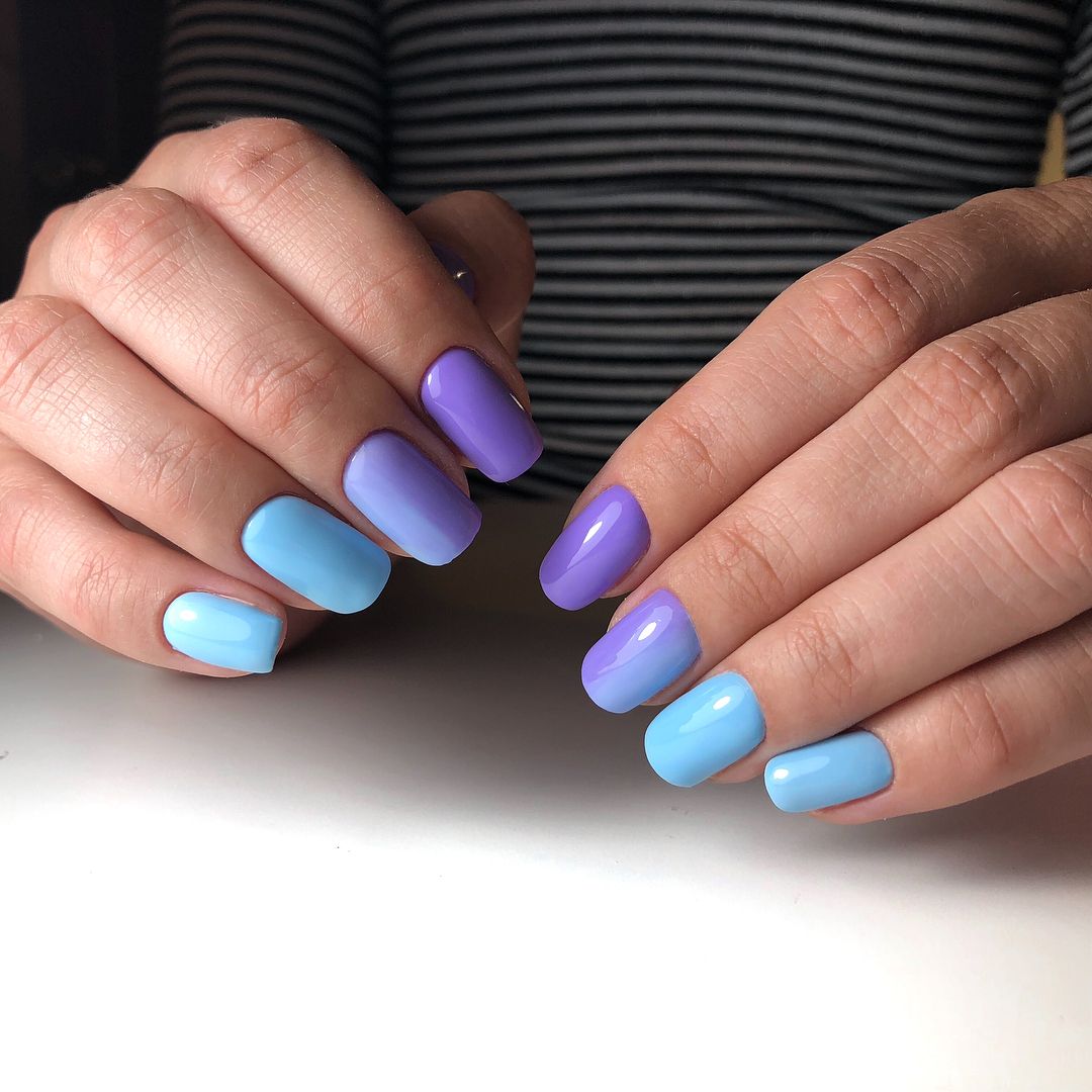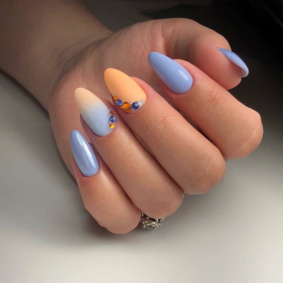 Также есть вариант градиента синего с другими оттенками. Если добавить оранжевый и розовый, получится аккуратный нежный дизайн, напоминающий закат.