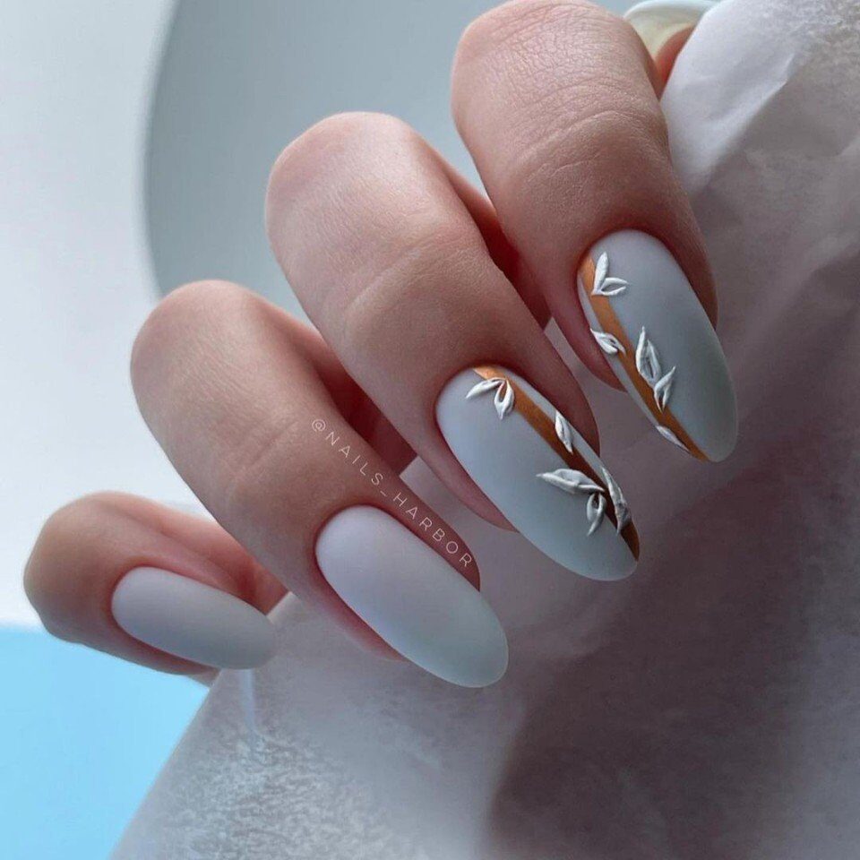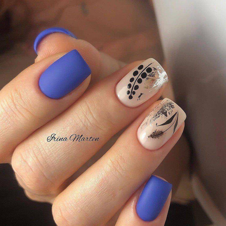 Немного разнообразить синий матовый маникюр на коротких ногтях поможет дизайн — это может быть растительный принт или даже анимализм.