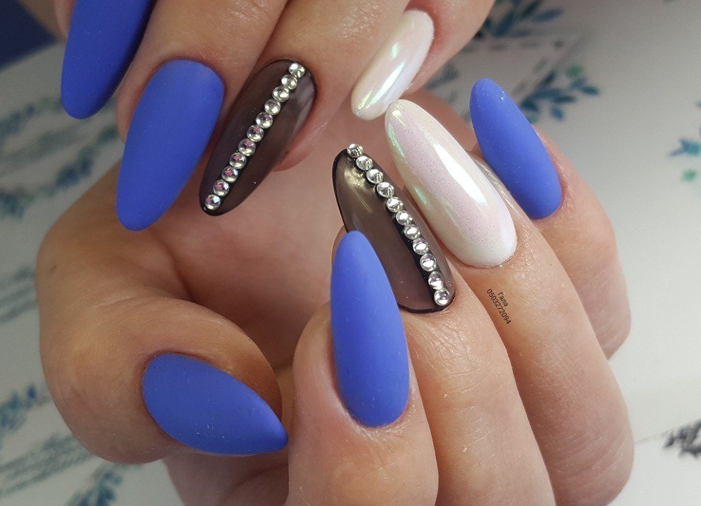 Разнообразие стразов сегодня огромно. Сочетания камешков разного размера сейчас особенно актуально. Цветовой диапазон неограничен: к маникюру в синих тонах особенно подойдут бусины в хрустальных оттенках.