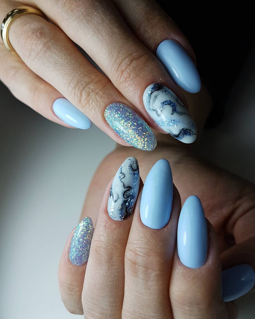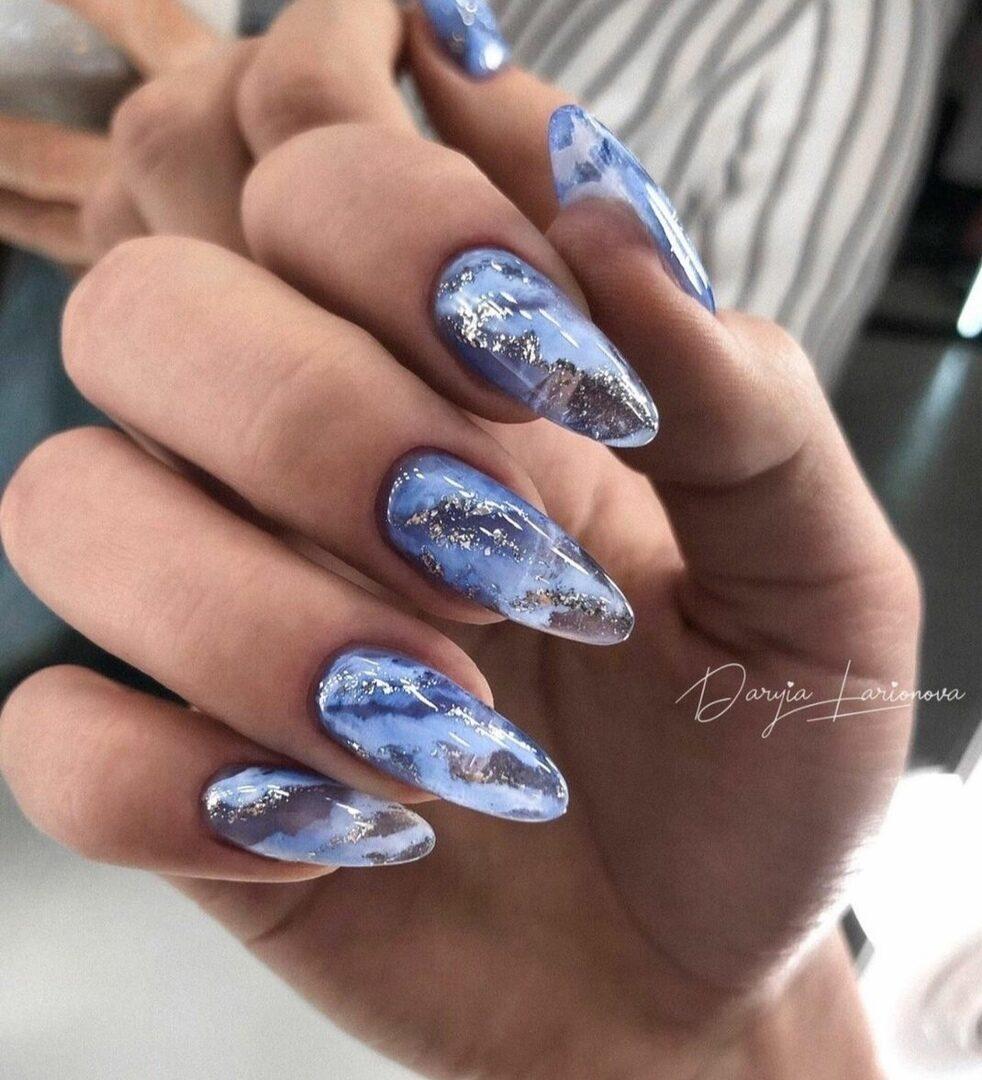 Популярный синий маникюр 2021 — оформление с разводами. Чтобы создать такой нейл-дизайн на палитре поставь 2-3 капли разных оттенков синего и аккуратно смешай между собой, чтобы получили разводы. Затем набирай понемногу и переноси на ноготь. Кстати, лучше всего переносить узор на непросушенный топ – линии будут лучше растекаться и в итоге дадут красивый рисунок.
