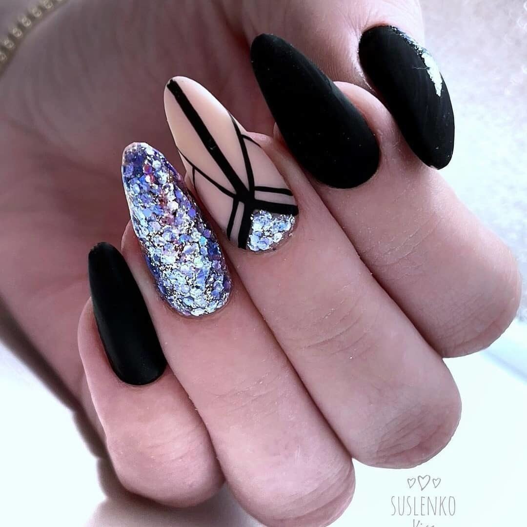 Черный цвет – достаточно смелый выбор для маникюра, но тем не менее, актуальный и популярный почти всегда. Оставаться в тренде черному цвету помогает не только его строгая лаконичность, но и множество разнообразных техник нанесения лака, украшений в виде бусинок, страз, камней, камифубуков, фольги, рисунков, различных видов блесток, блестящих втирки и нитей для декора маникюра.