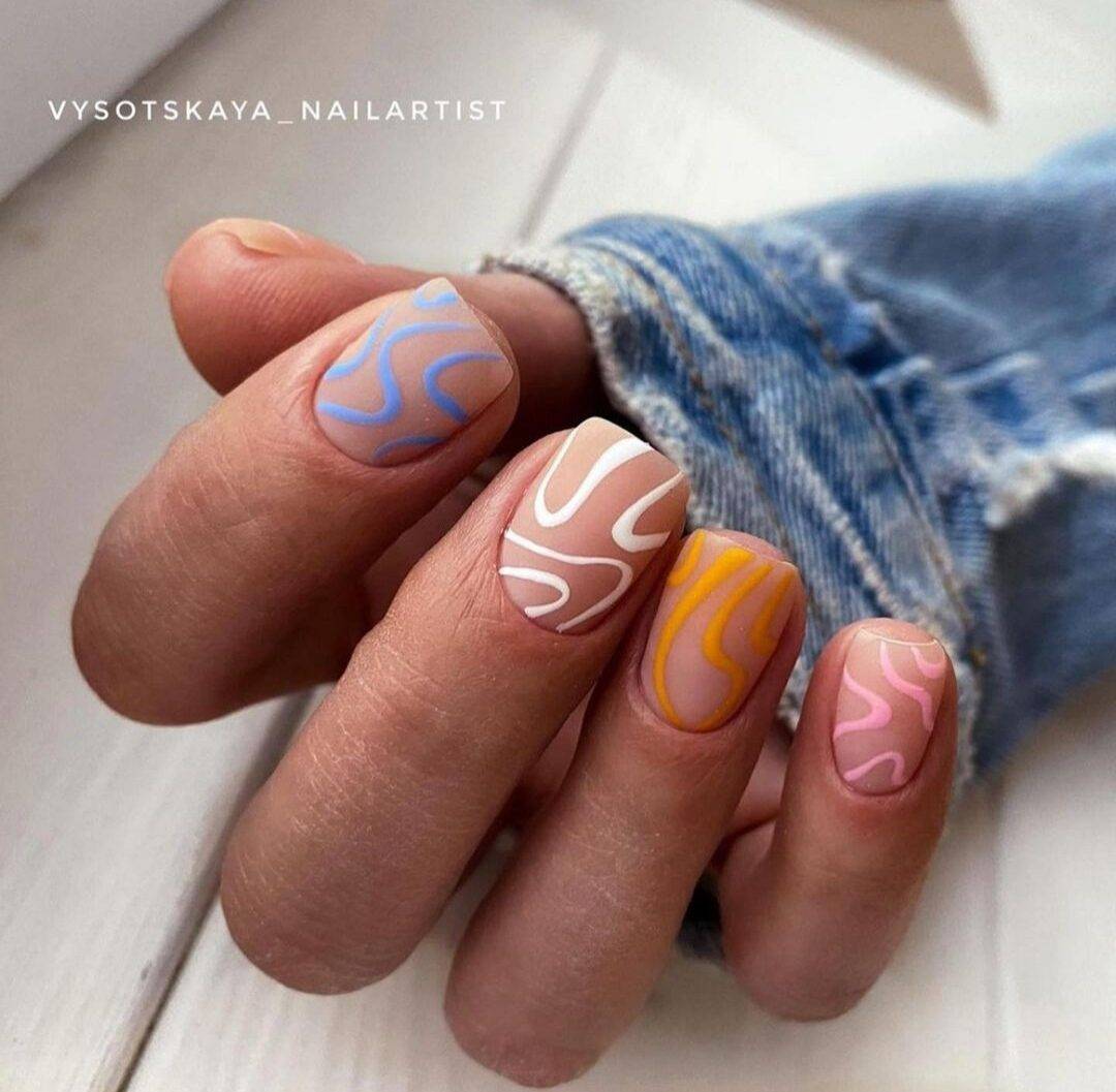 Среди актуальных предложений лаконичные линии, нанесённые на основание ногтей в хаотичном порядке, сложные геометрические композиции и абстрактные мотивы. Не покидают список популярных предложений различные цветочные изображения, клеточки и ажурные завитки.