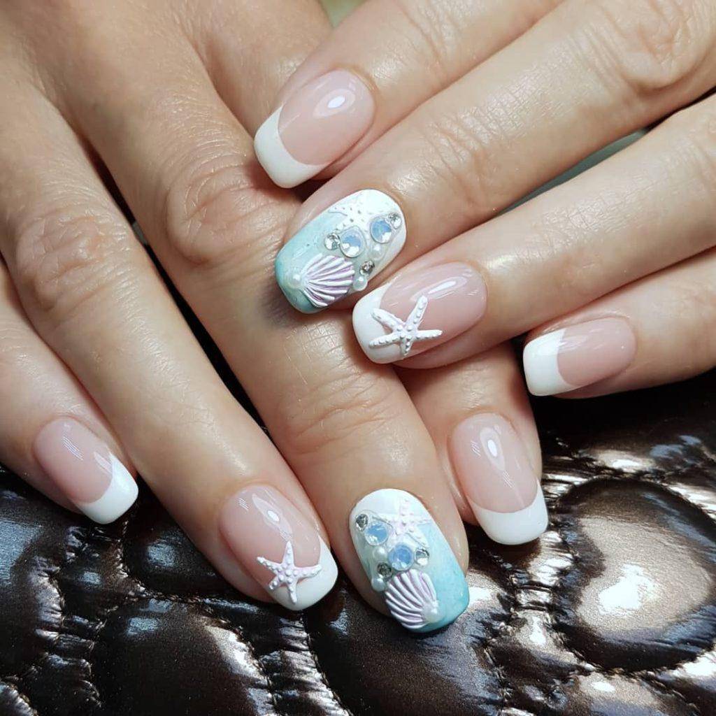 Френч – это классика, но не всегда все должно быть одинаково. Например, улыбка в таком дизайне необязательно должна быть белой. Ее можно выполнить и в голубом цвете, сегодня это считается трендом.