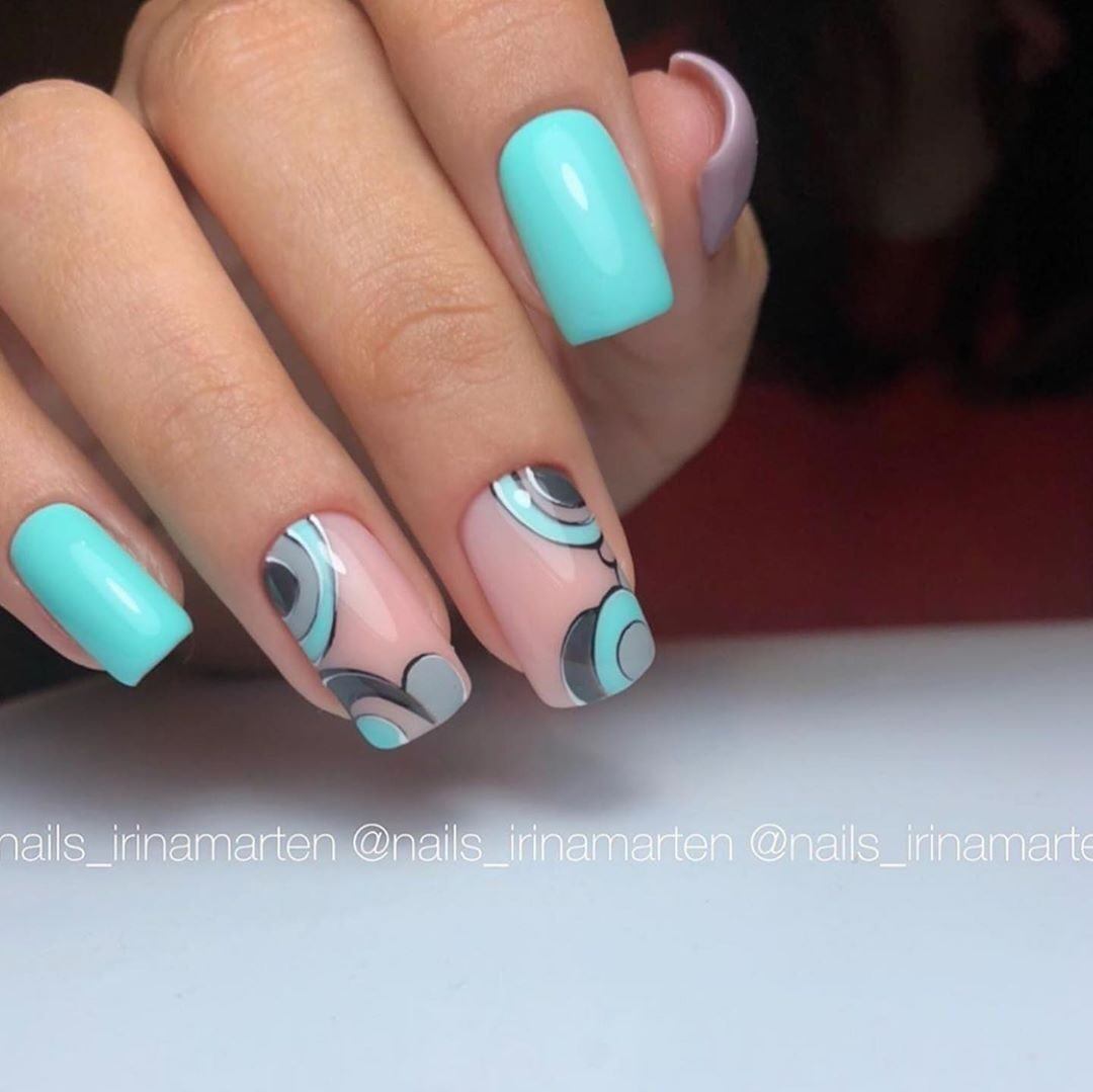 Лидирующим направлением в сфере рисунков в 2020 году стала геометрия на ноготках. Голубая нежная основа – это идеальное решение для выполнения художественного дизайна. Кривые, прямые линии, круги, эллипсы, прямоугольники, квадраты или абстракция прекрасно сочетаются с другими техниками и удачно дополняют различные образы девушки