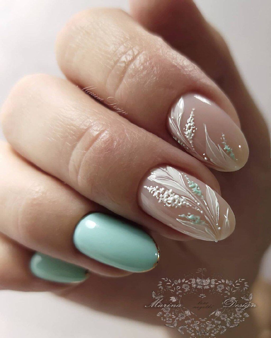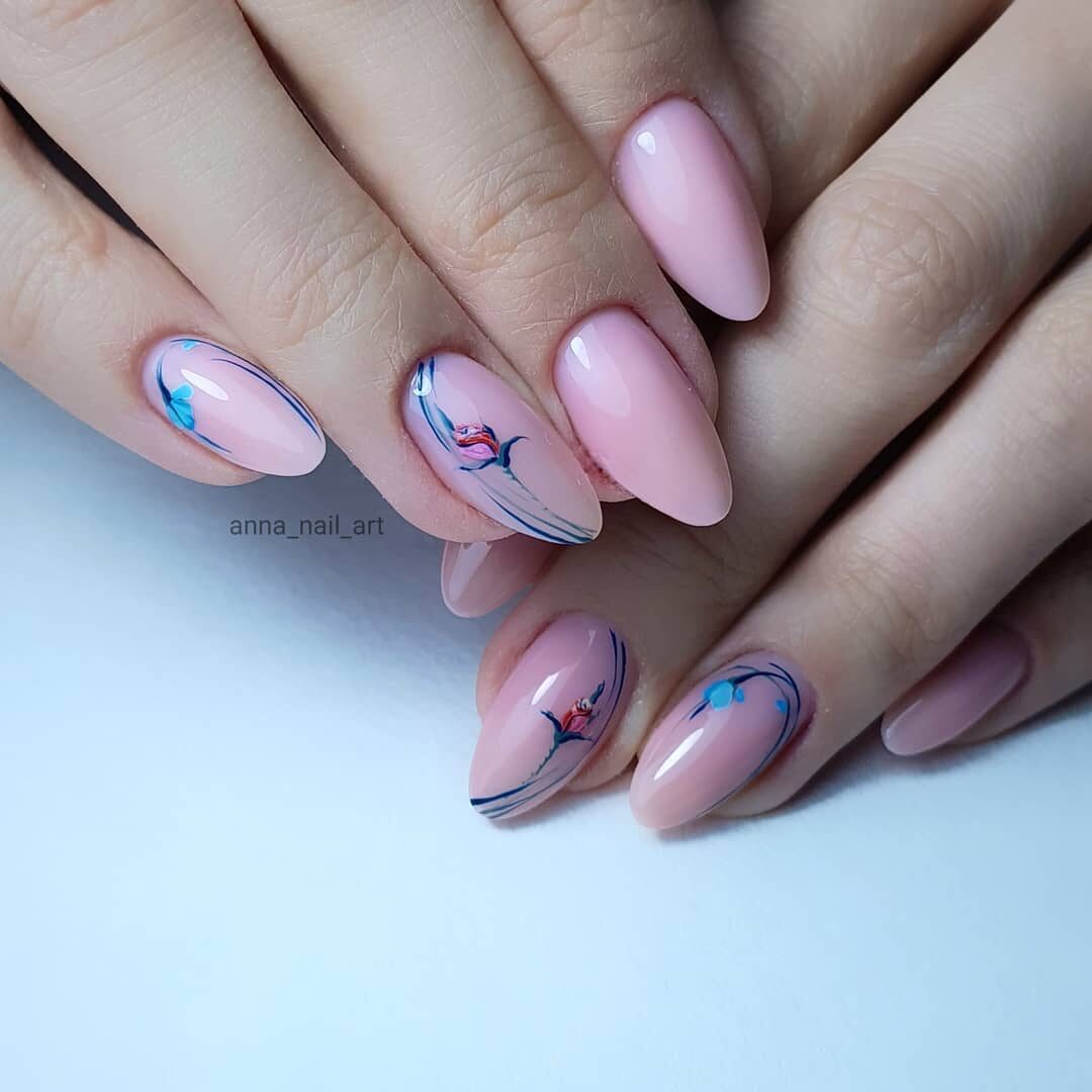 Помимо геометрических мотивов, обратите внимание на флористические рисунки. Такие элементы достаточно нанести на несколько ноготков, и маникюр будет выглядеть изысканно, романтично и нежно. В основном при помощи рисунков украшают всего несколько ноготков, а в этом году это большой и безымянный пальчик