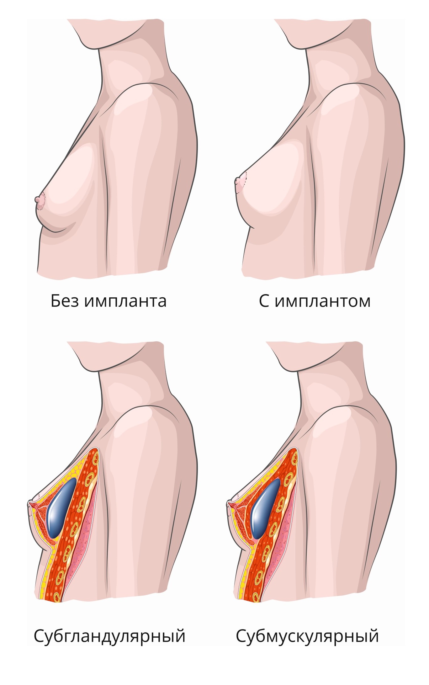 Расположение имплантов в тканях железы может быть различным. Практикуют следующие виды установки:
