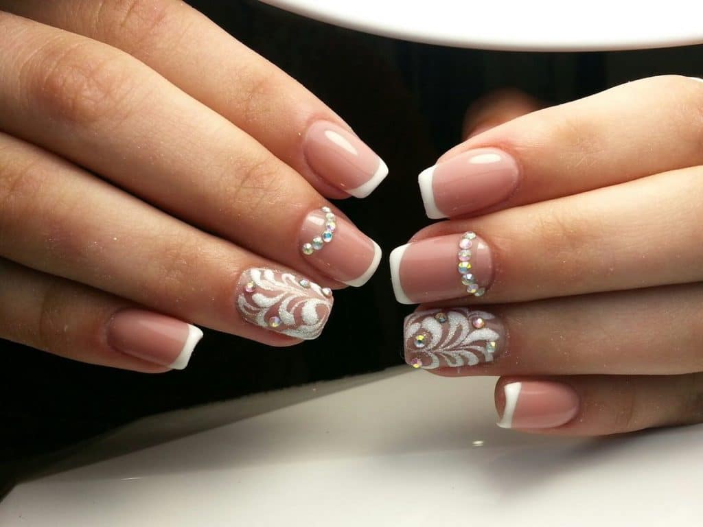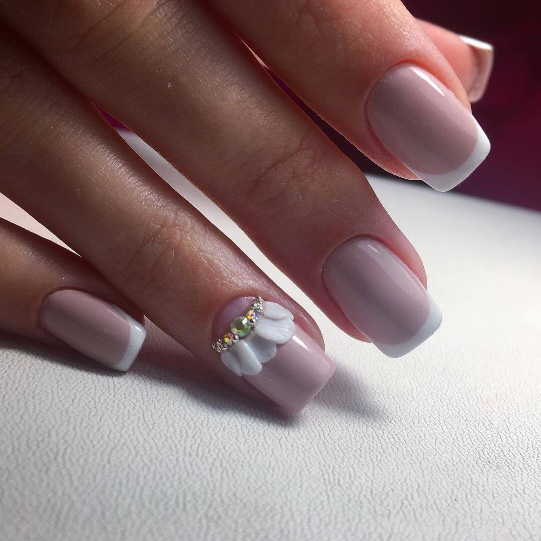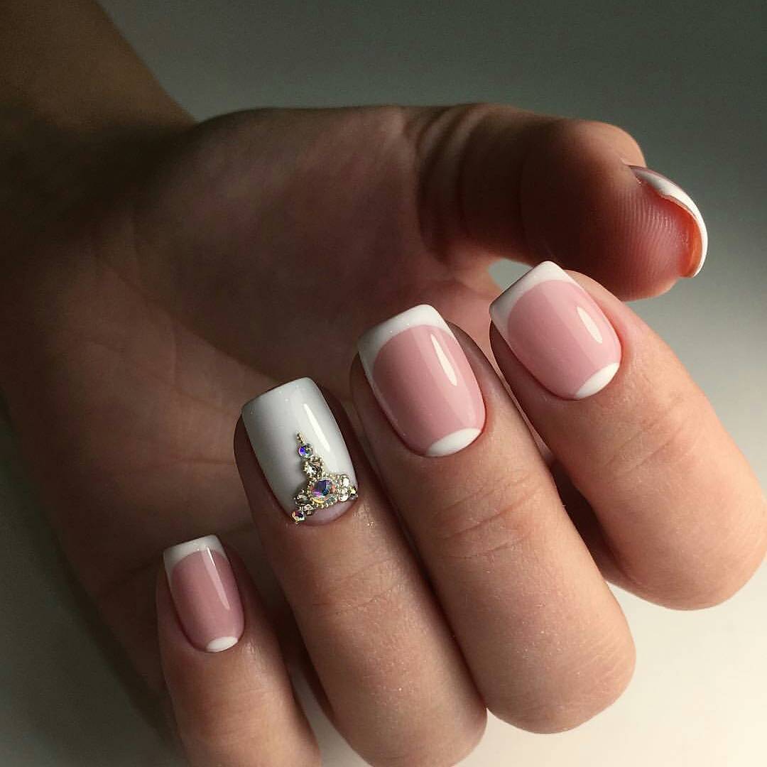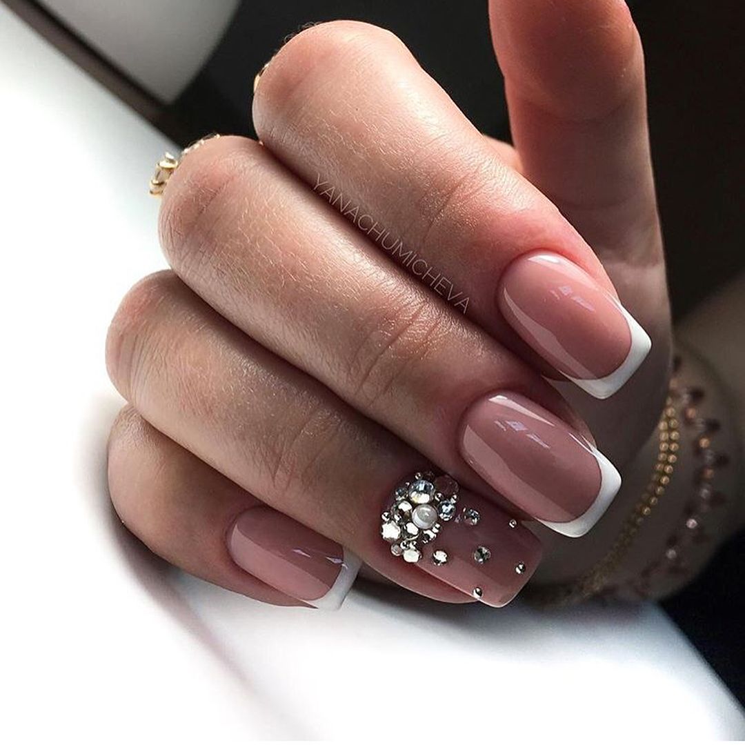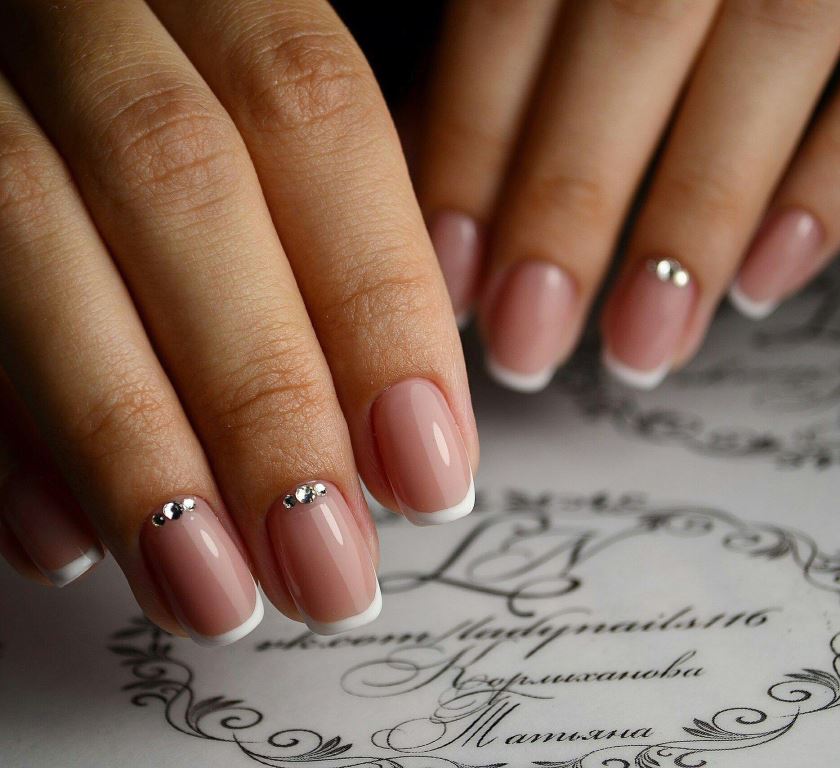 В данном случае французский маникюр для этого подходит идеально. При желании его можно украсить россыпью страз или же небольшим количеством блесток.