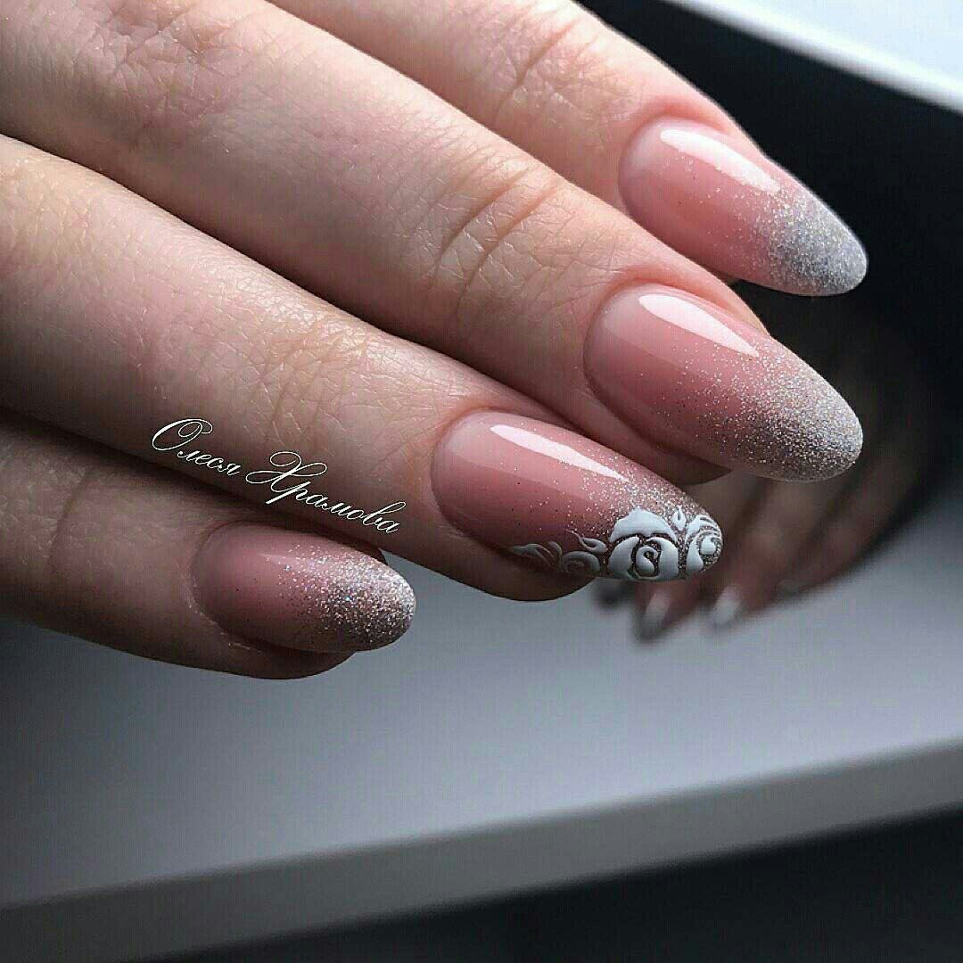 Популярным на сегодня считается нюдовый маникюр с использованием глитера. Один или два ноготка, покрытых полностью или частично блестками, подчеркивают утонченность и отличный вкус.