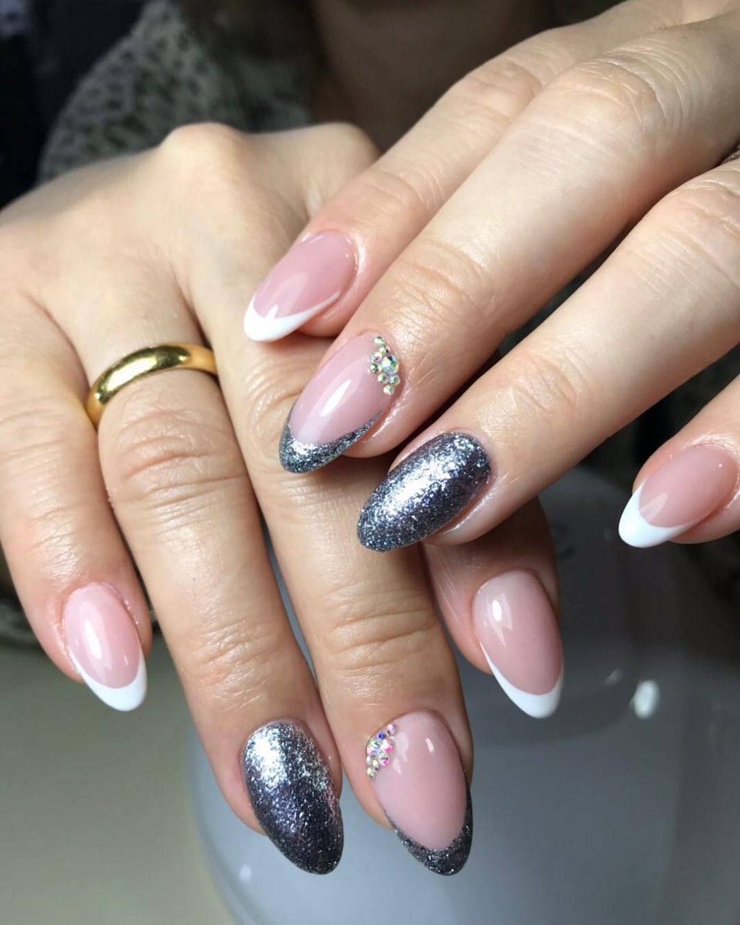 - комбинированный френч с блестками – имеется ввиду сочетание френча и лунного маникюра. Располагайте блестки в тех местах, где должна быть прорисовка края ногтевой пластины и лунки. Чередуйте гель-лак с блестками на разных ногтях, добавьте в дизайн стразы.