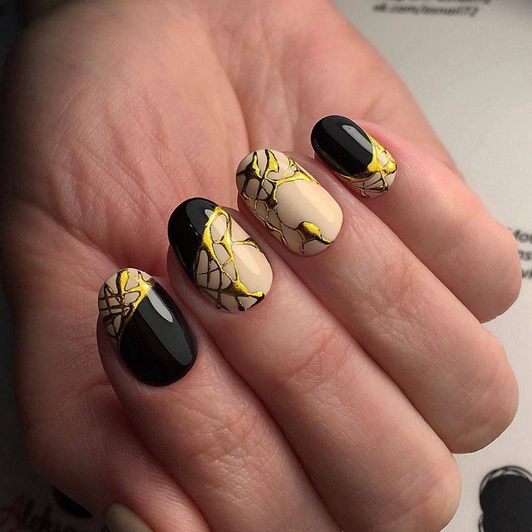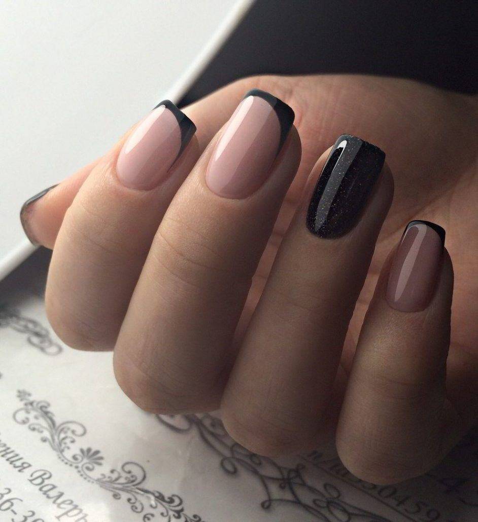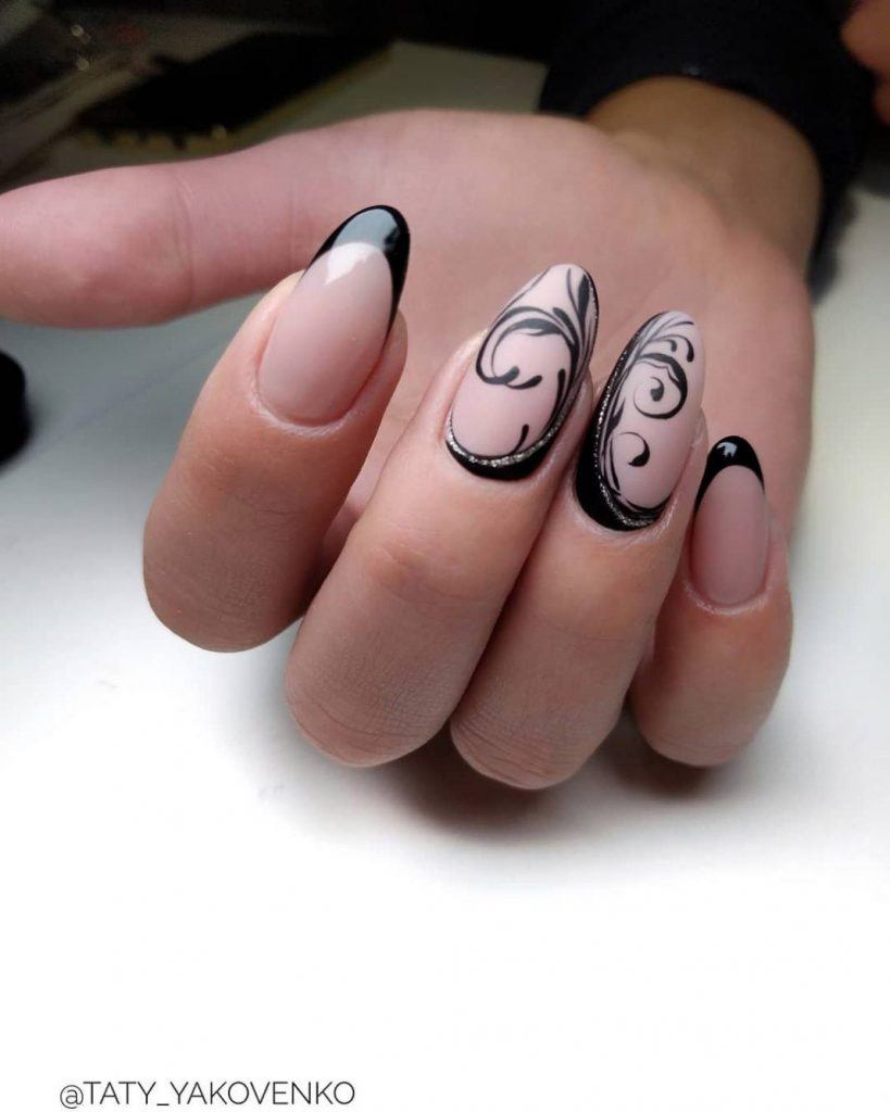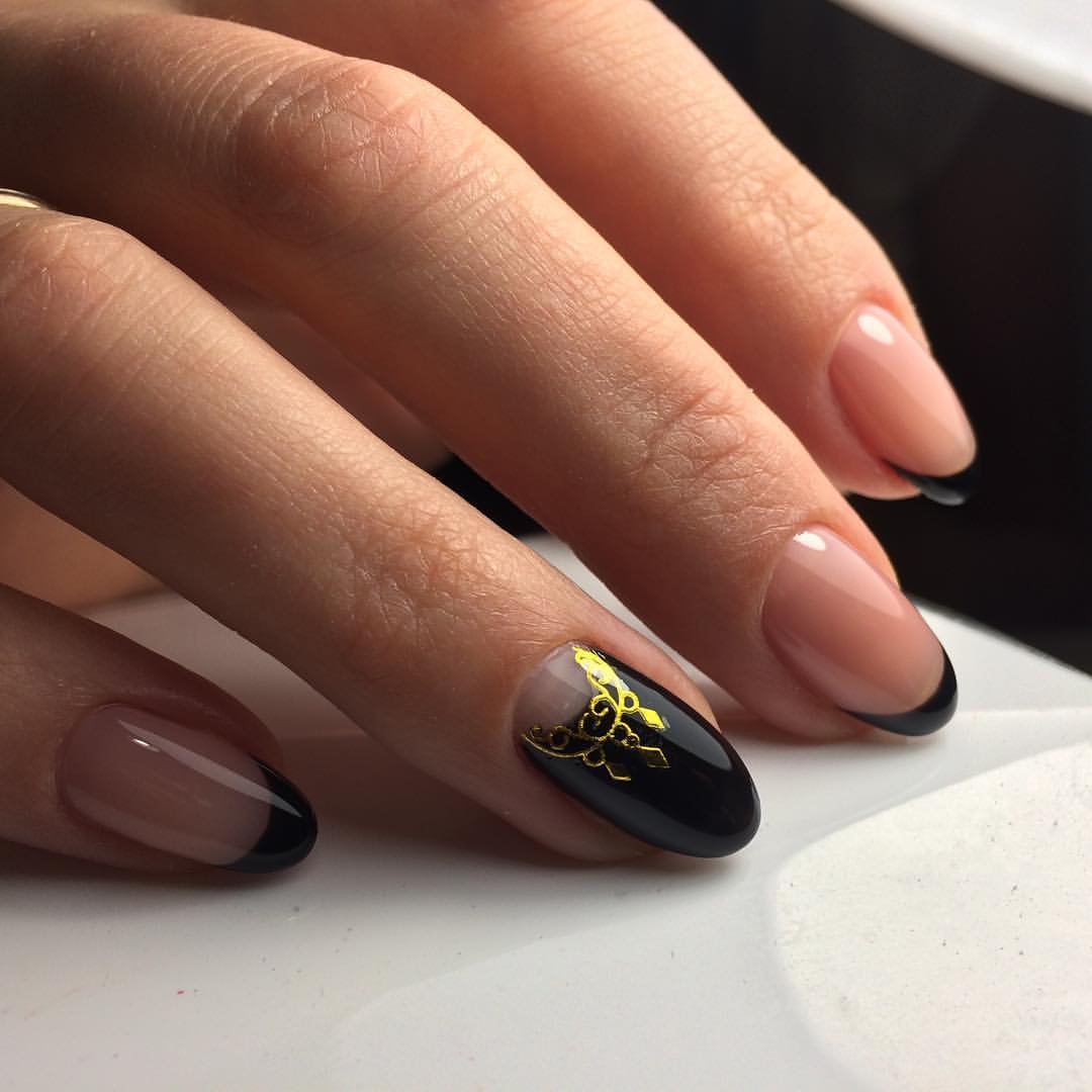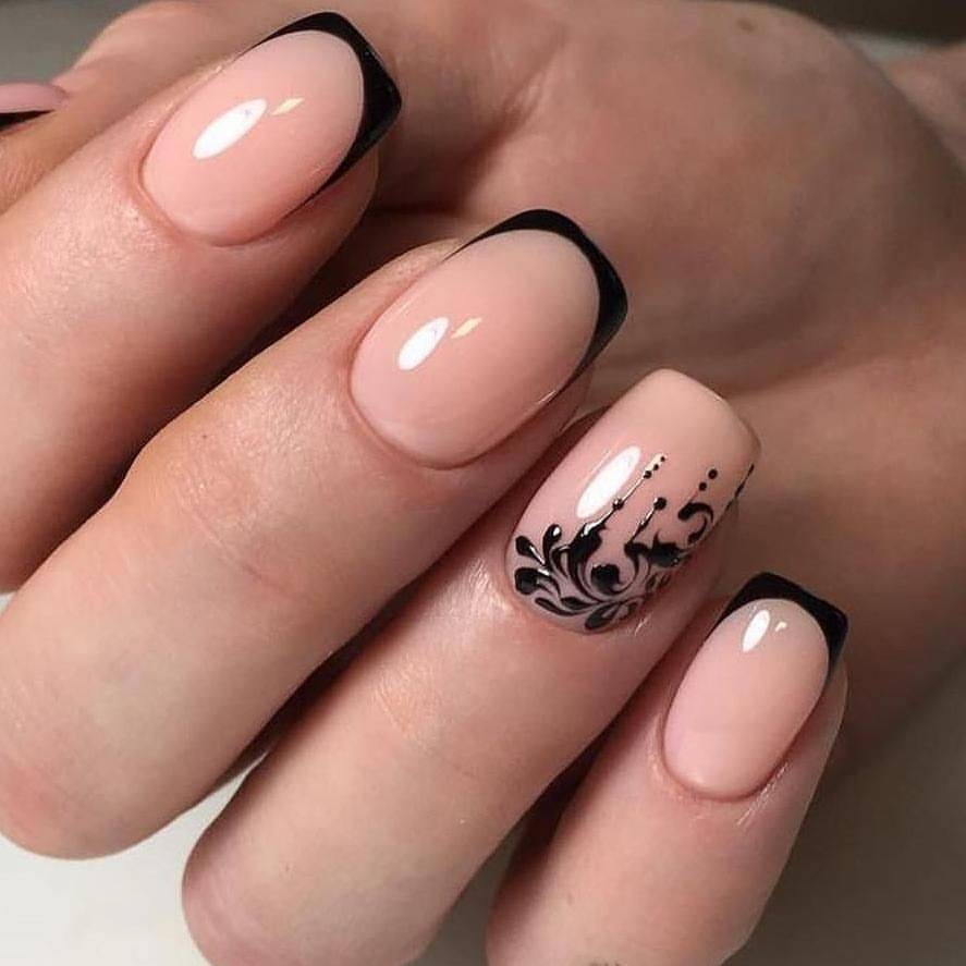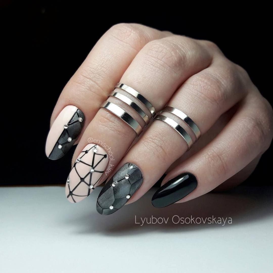 С нюдовыми оттенками хорошо констрастирует черный цвет, поэтому он часто встречается в декоре на длинных ногтях, где есть место для фантазии. А скромные маленькие стразы или блестки придадут маникюру утонченность и сияние.