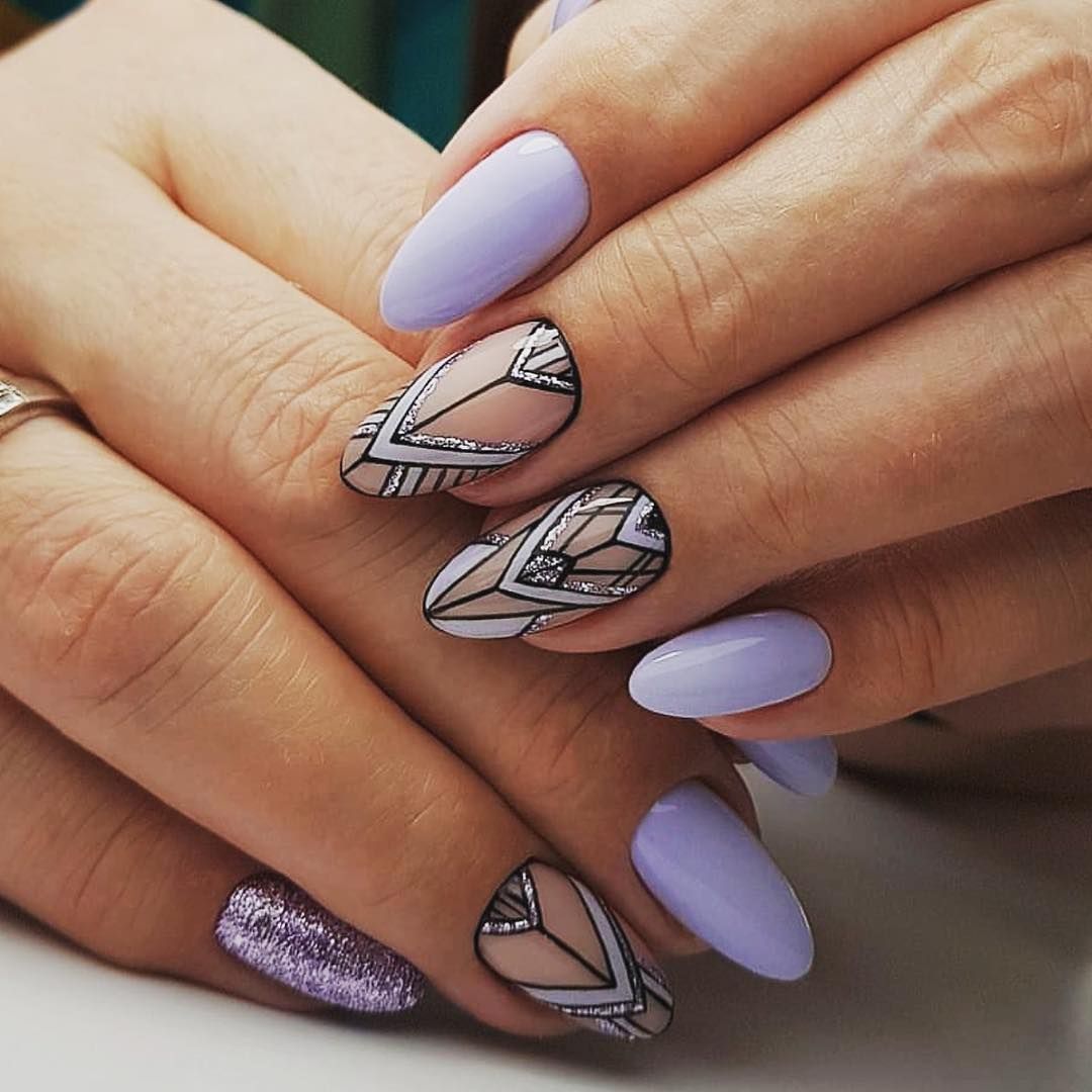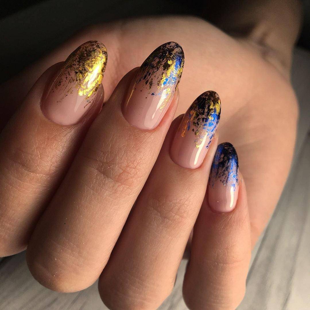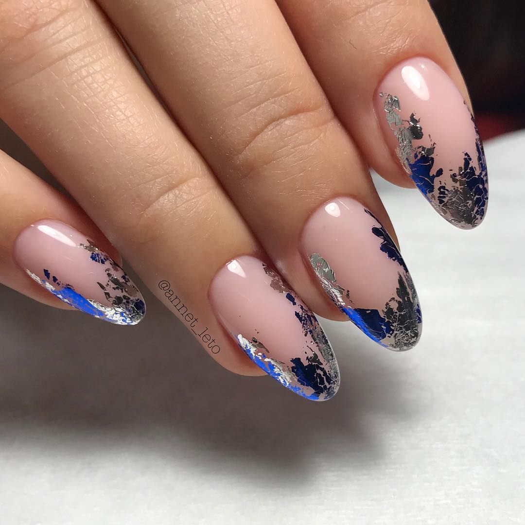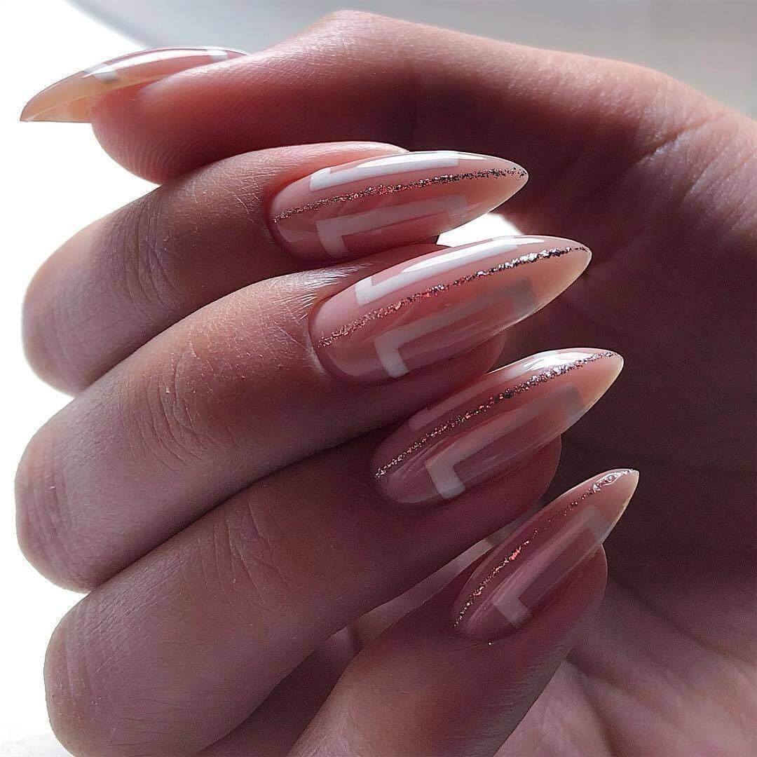 В случае с нюдовыми миндалевидными ногтями, блестки станут идеальным дополнением к лунному маникюру. В тренде различные линии, мрамор, хаотичные пятна и разводы. Так как миндаль предполагает продолговатую форму, можно не бояться, что визуально будут укорачиваться пальцы.