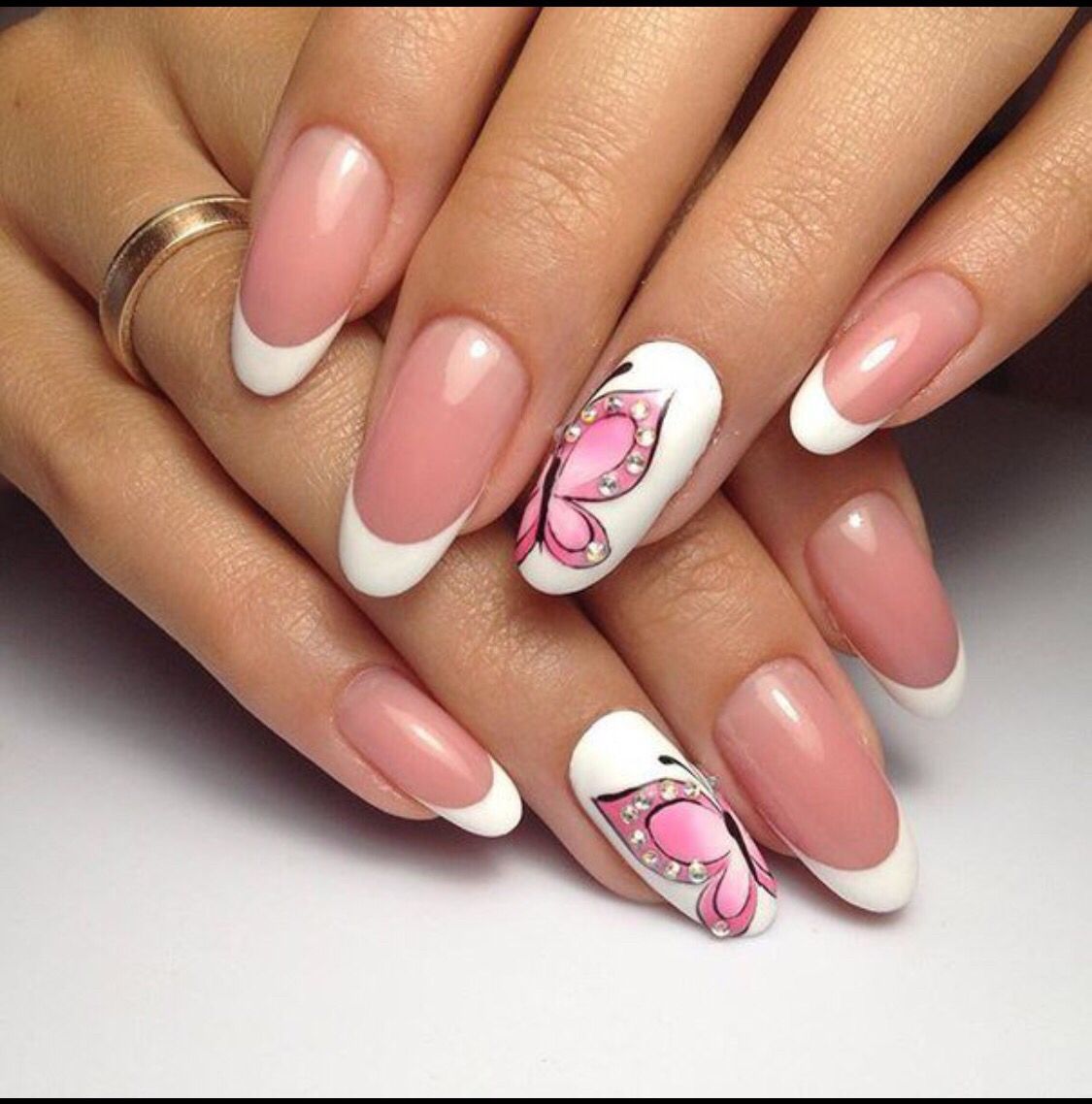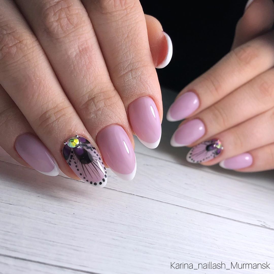 Поскольку цветной французский маникюр чаще всего достаточно яркий, его можно смело комбинировать с соответствующим рисунком. Изображение бабочек в данном случае будет смотреться невероятно красиво и лишь подчеркнет оригинальность маникюра. Чтобы дизайн выглядел реалистично, лучше всего использовать слайдер-дизайн с напечатанным рисунком. Выбранный фрагмент необходимо разместить в небольшом количестве воды буквально на минуту. После чего с помощью апельсиновой палочки надо аккуратно перенести его на ноготок. Затем просто закрепите рисунок лаком.