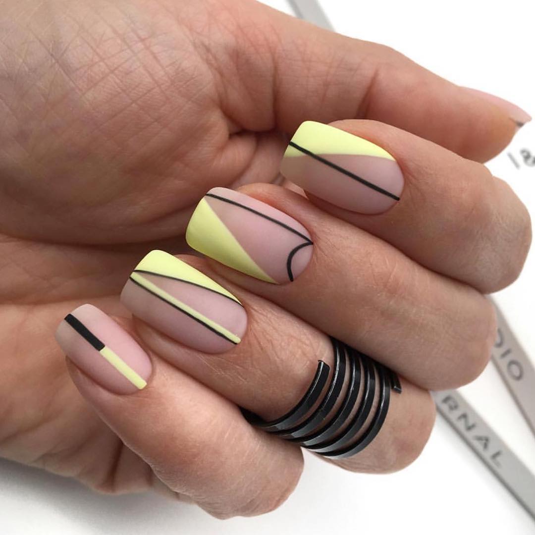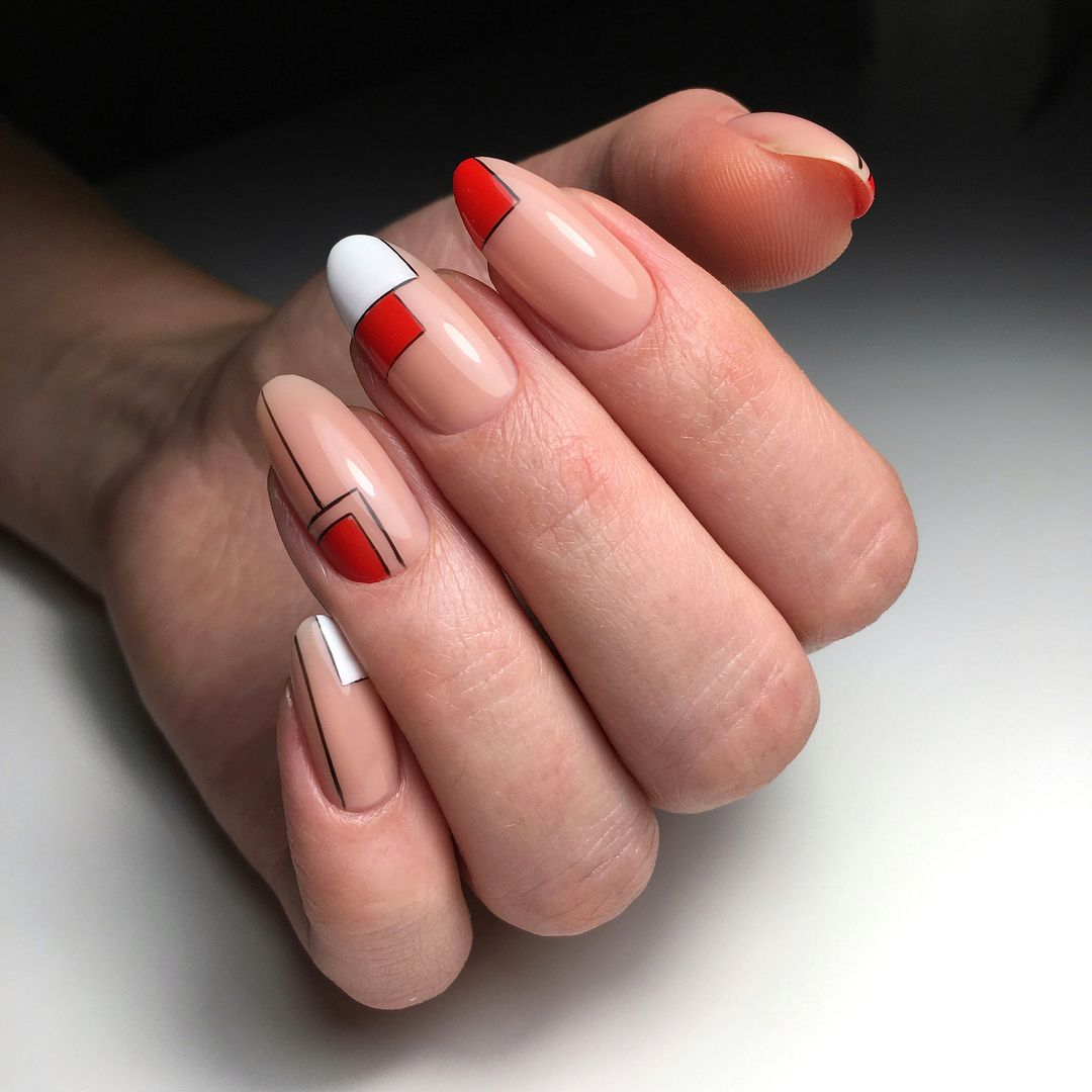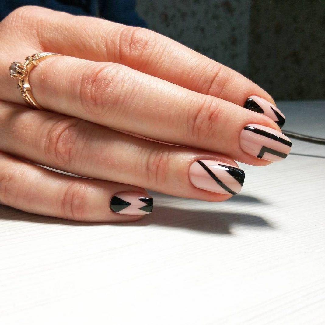 Современный дизайн ногтей с бежевым гель-лаком и геометрическими рисунками