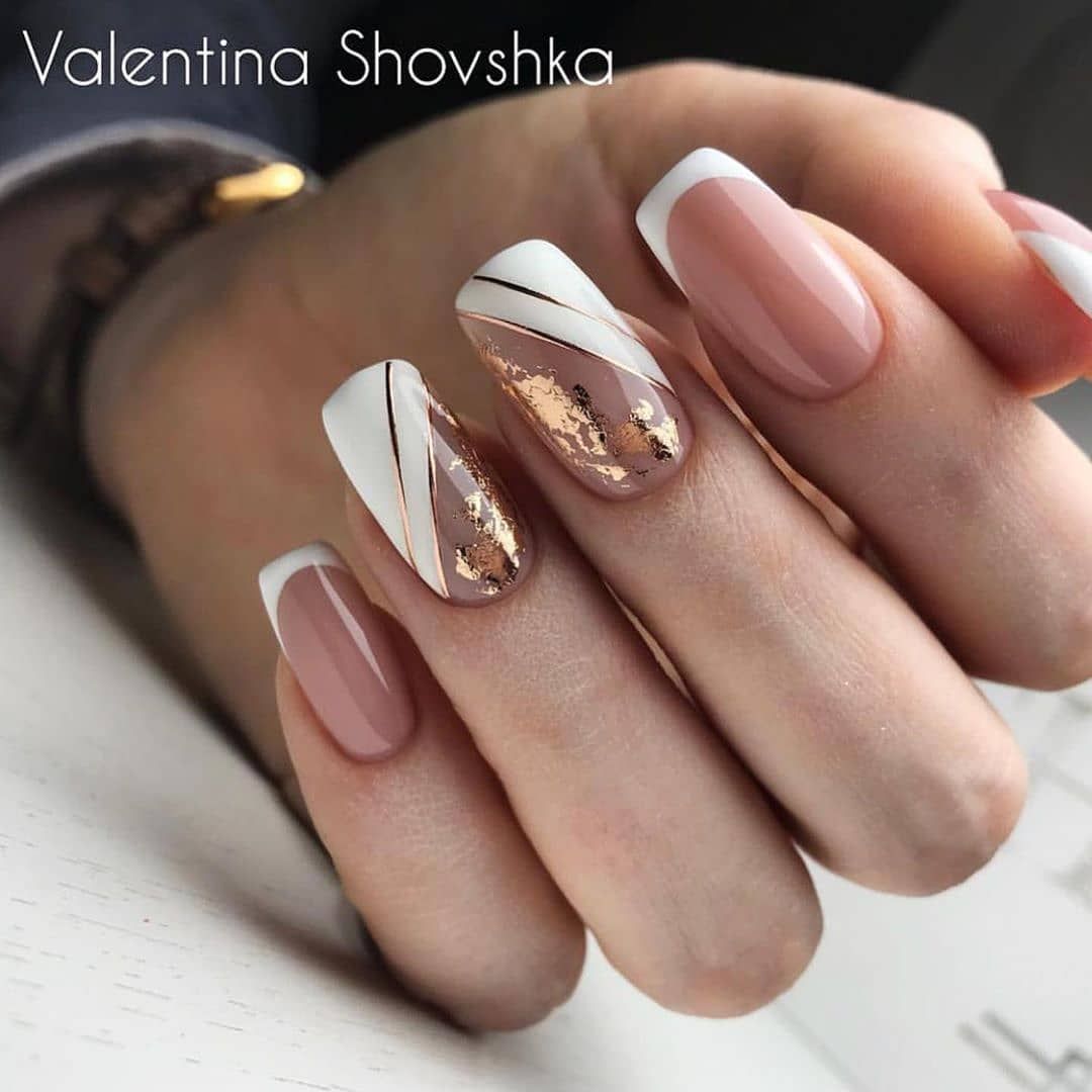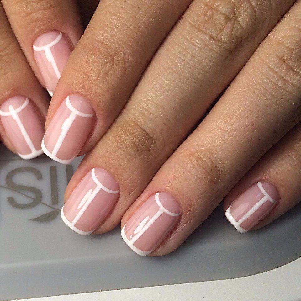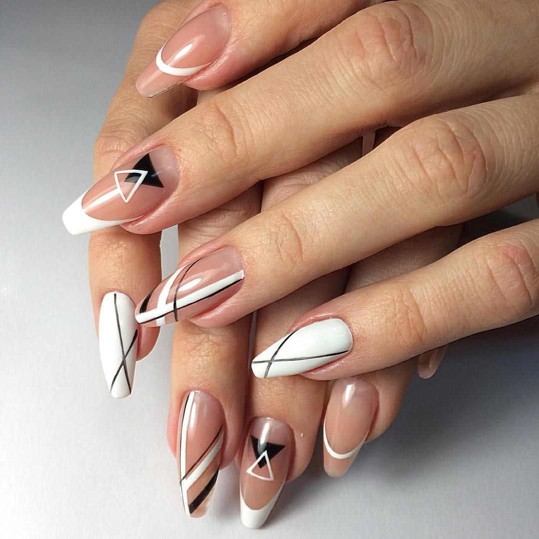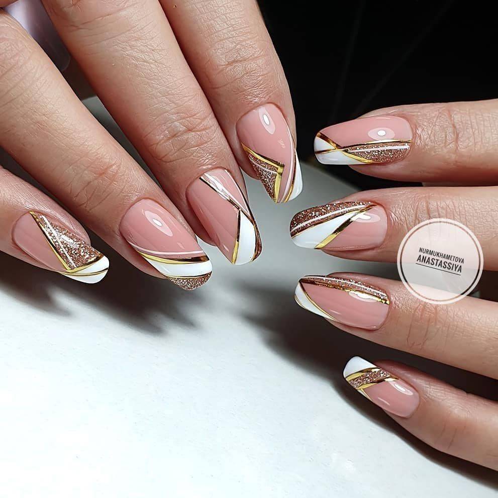 Современный дизайн ногтей с бежевым гель-лаком и геометрическими рисунками