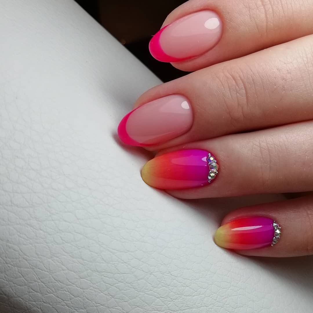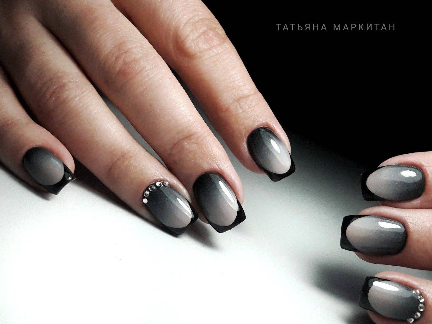 Плавный переход оттенков всегда привлекает внимание, особенно если он выполнен в контрастных тонах. Поэтому лучше всего комбинировать его с нейтральной основой. В данном случае французский маникюр для этого подходит идеально