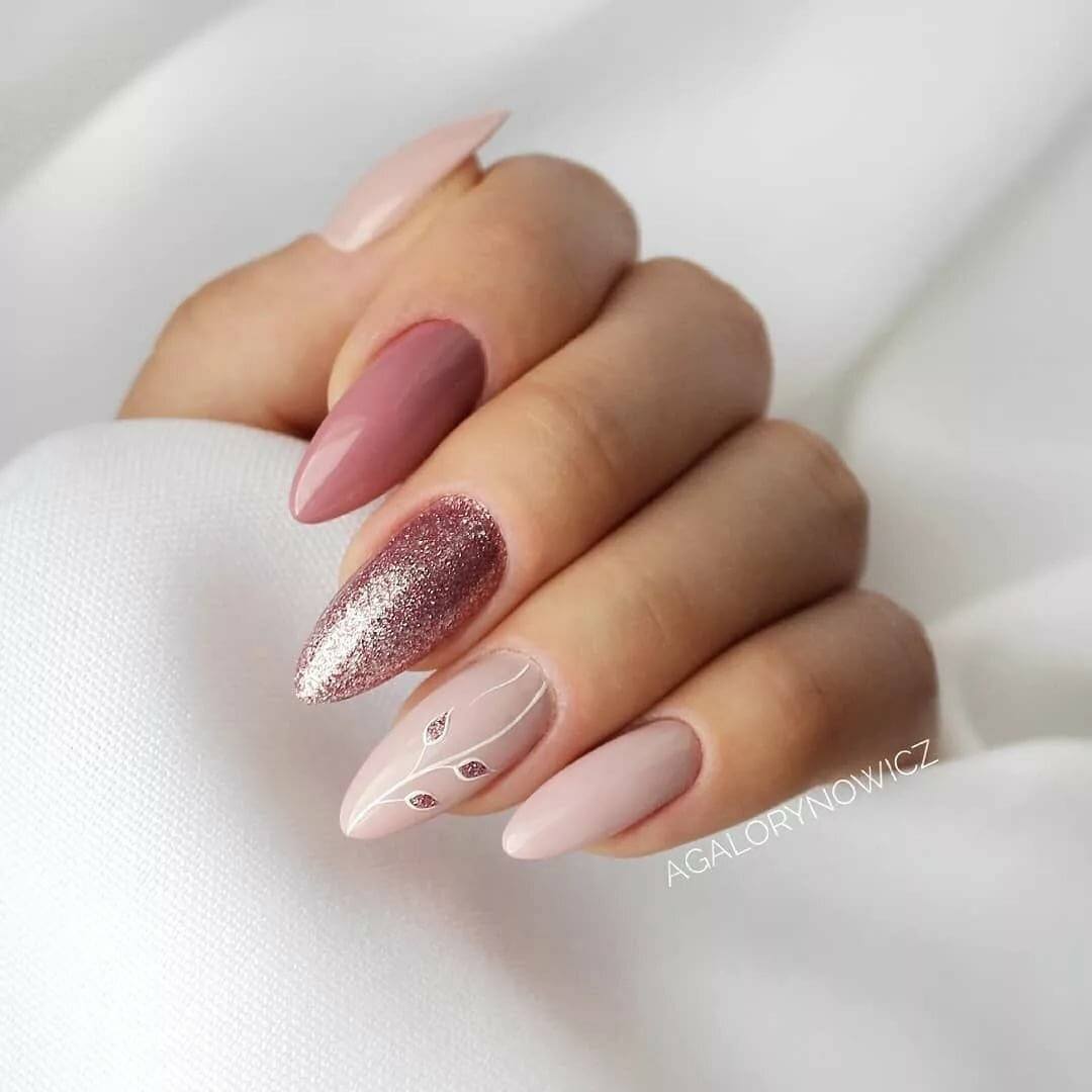 На короткой форме миндаля выбирайте упрощенный дизайн с минимумом рисунков. Однако применение глиттера с разными размерами его частиц сделает образ женственным и утонченным.