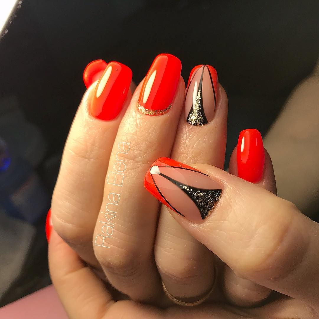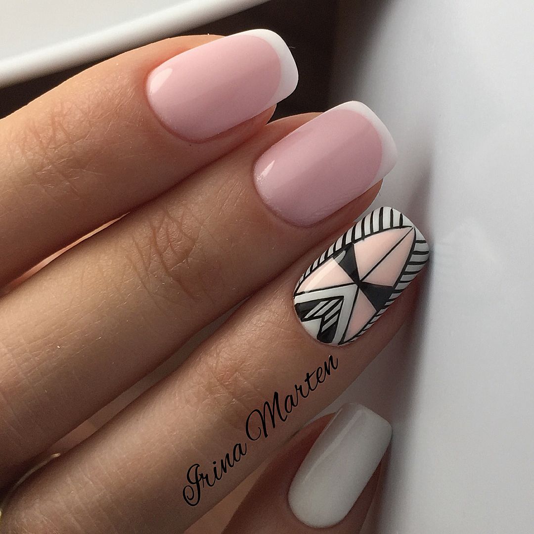Геометрический рисунок вот уже несколько лет не покидает список самых модных видов дизайна ногтей. Это не удивительно, поскольку он лаконичный, не слишком активный и хорошо смотрится в любом цветовом решении. Классический френч в любом оттенке будет отличной базой для такого рисунка. Выполнить его можно как в салоне, так и самостоятельно. Поскольку для этого понадобится лишь тонкая кисть, которую часто заменяют простой зубочисткой или иглой. Достаточно немного потренироваться на бумаге и у каждого получится нарисовать ровные линии на ногтях. В качестве декора в данном случае уместной будет скотч-лента, а также оттиски фольги.