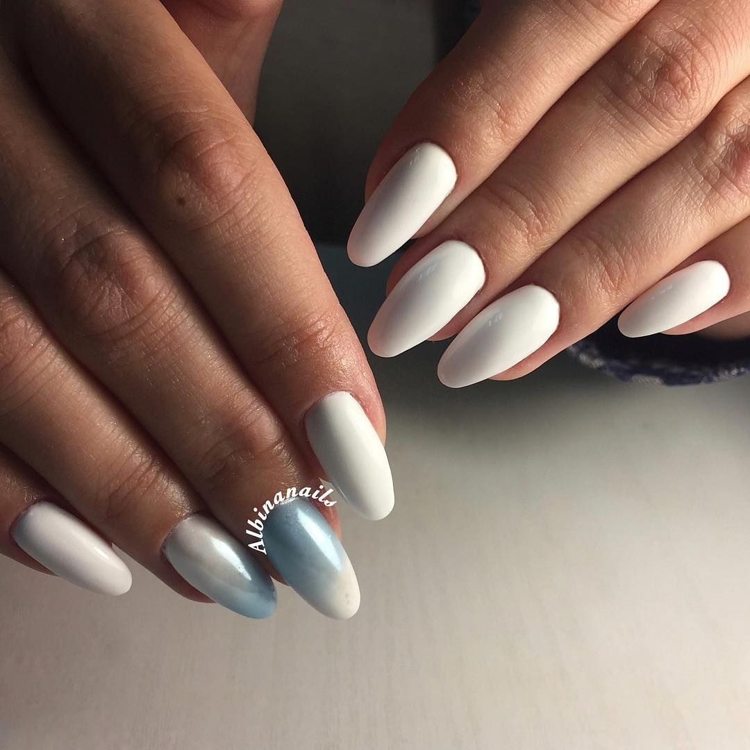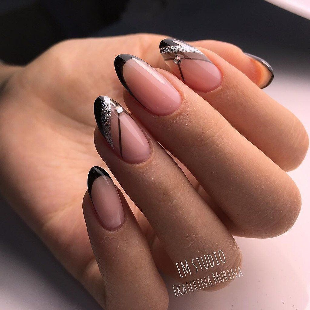 В тренде однотонное покрытие, дизайн с растяжкой блестками, французский и лунный маникюр, дизайн с блестками и стразами. На миндальной форме красиво смотрится дизайн с фольгированными лентами. Такой маникюр шикарно смотрится в повседневных и деловых образах, выдает в своей обладательнице утонченную натуру.