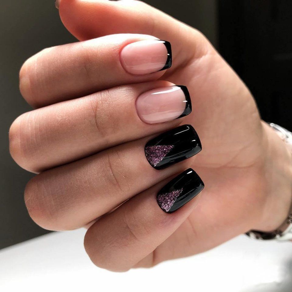 - декор геометрических форм – помимо классической формы «улыбки» можно использовать треугольную, скошенную и другие. Именно эти необычные формы великолепно сочетаются с блестками. Повторите контур «улыбки» стразами или создайте стильный твист-френч, где одним из оттенков будут переливающиеся блестки.