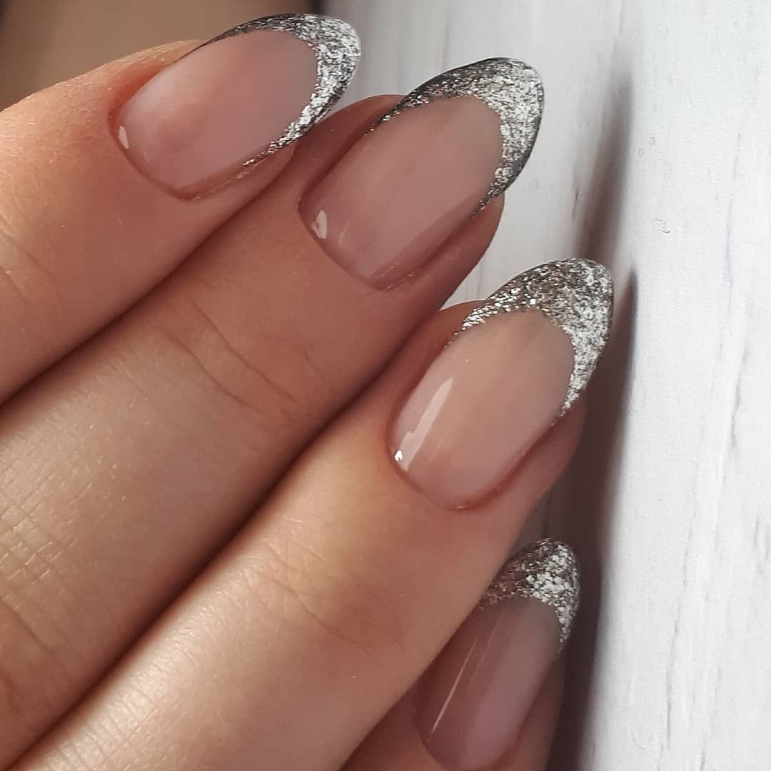 #2 Нюдовый маникюр с блестками на миндальные ногти