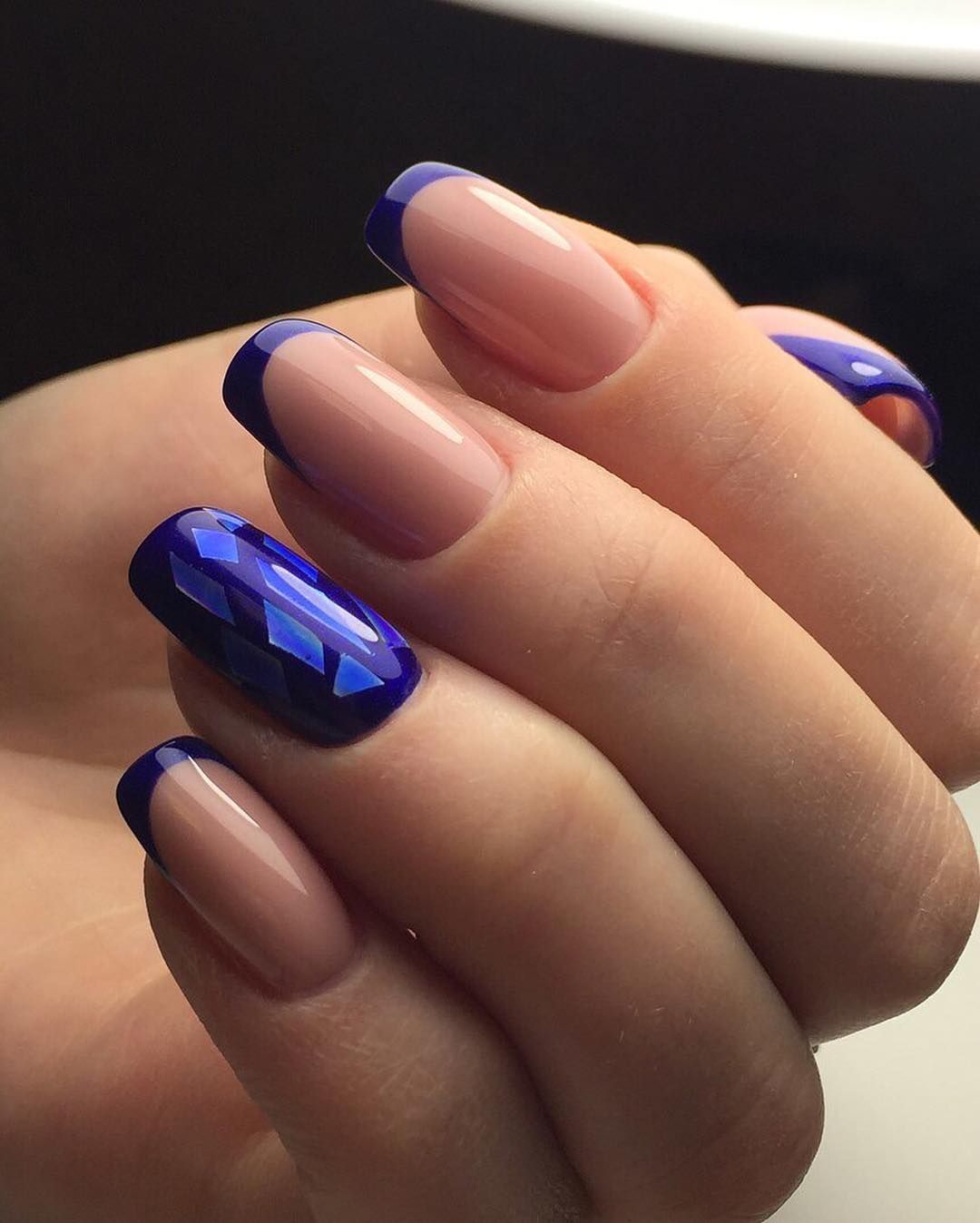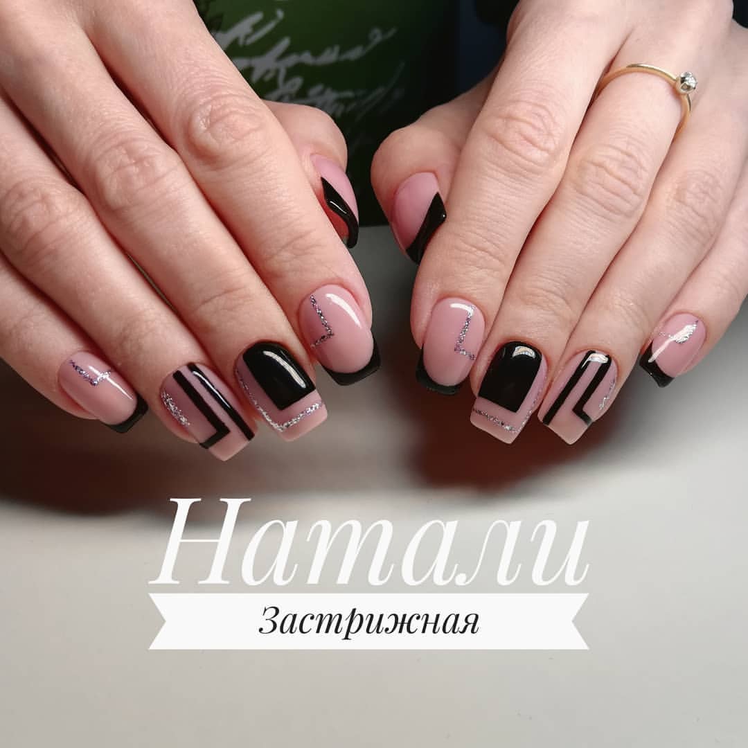Квадратную форму выгодно подчеркнет глиттер в сочетании с геометрией или классический белый френч. Кроме того, интересно смотрится сочетание с матовым покрытием.