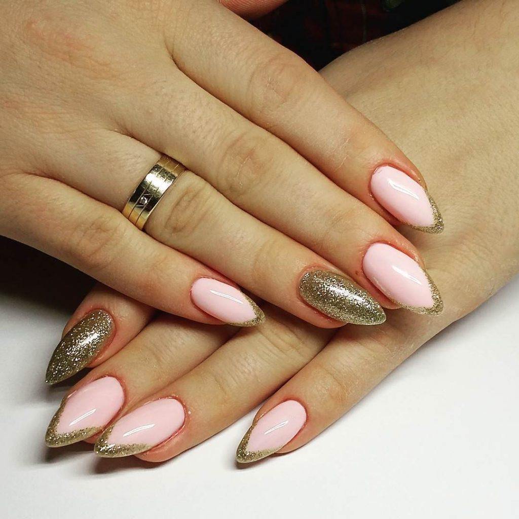 На миндальных ногтях рекомендуется выполнять минималистичный декор блестками и стразами. Присмотритесь к нейл-артам с полосками, выложенным из стразов или украшенным глиттером. Интересно смотрится лунный маникюр с глиттером в прикорневой зоне.