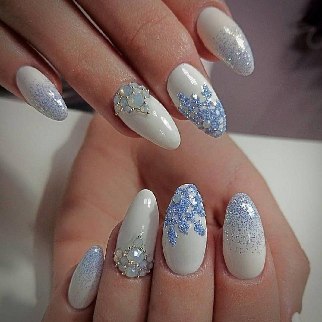Разбитое стекло или размытые полосы белого и синего цветов могут помочь создать эффект воды. Нестандартным решением станет геометрический маникюр в оттенках синего или белого, дополненный скотчем.
