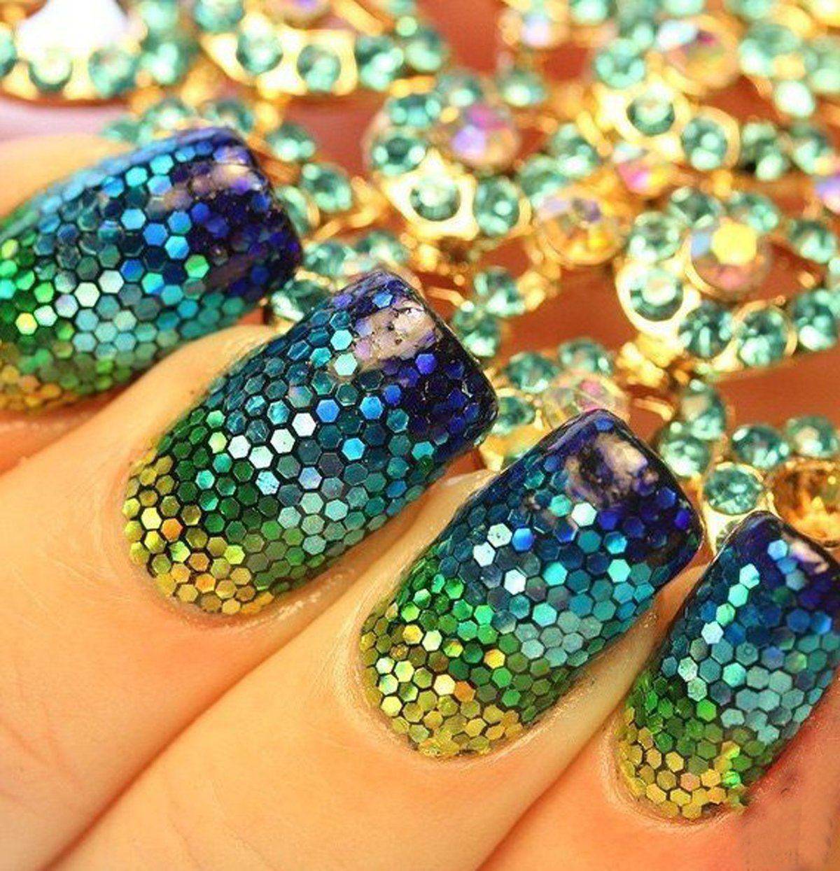 Удивительный насыщенный цвет морской волны полностью самодостаточен, и даже простая краска этого цвета — уже беспроигрышный вариант. Сочетание разных фактур и немного блеска, выгодно разбавит однообразие будничного маникюра.