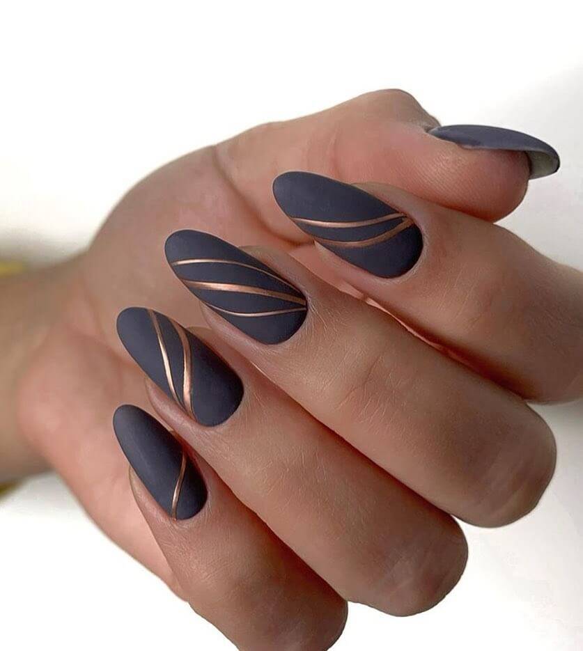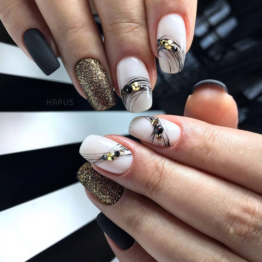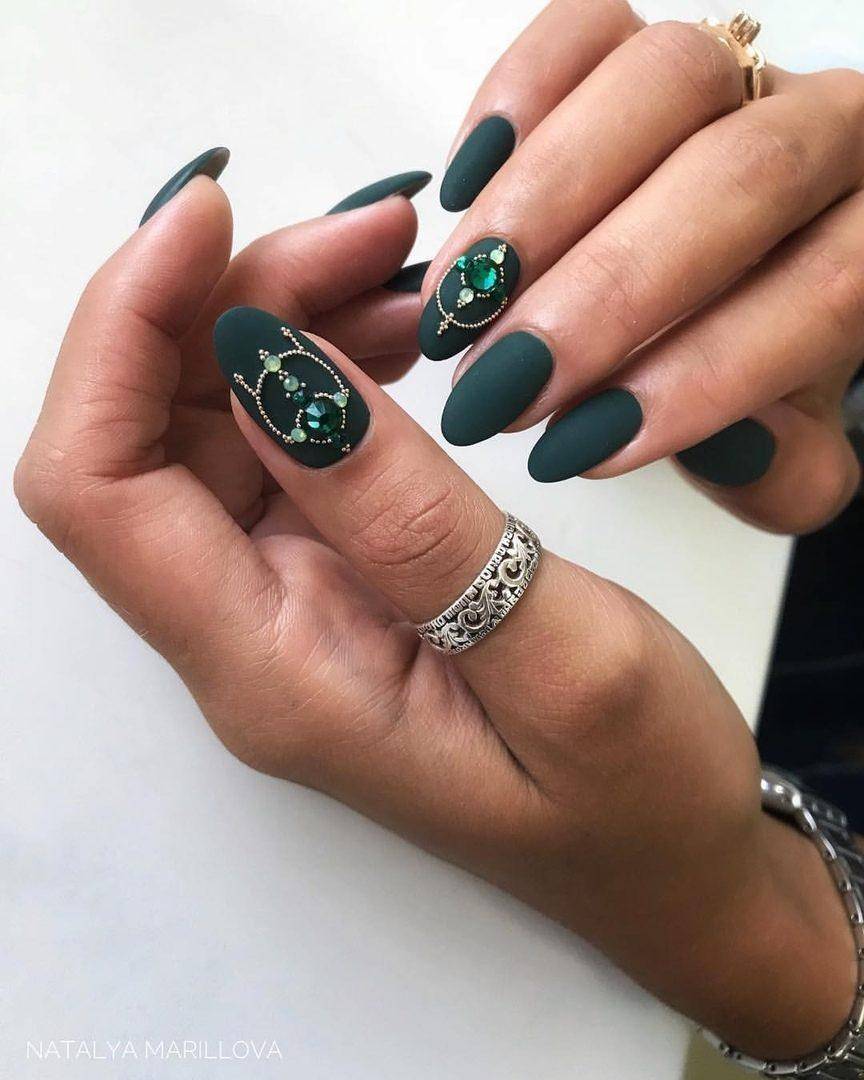 Матовый маникюр подходит для ногтей разной длины и формы. В матовом маникюре вы можете использовать и комбинировать разные техники нейл дизайна, его можно украсить блестками, дополнить рисунком, фольгой, втиркой. Для матового маникюра идеально подходят все темные оттенки, и он словно создан для инкрустации камушками и стразами, поэтому смело можете выбирать дизайн с камнями, на длинных ногтях они смотрятся роскошно.