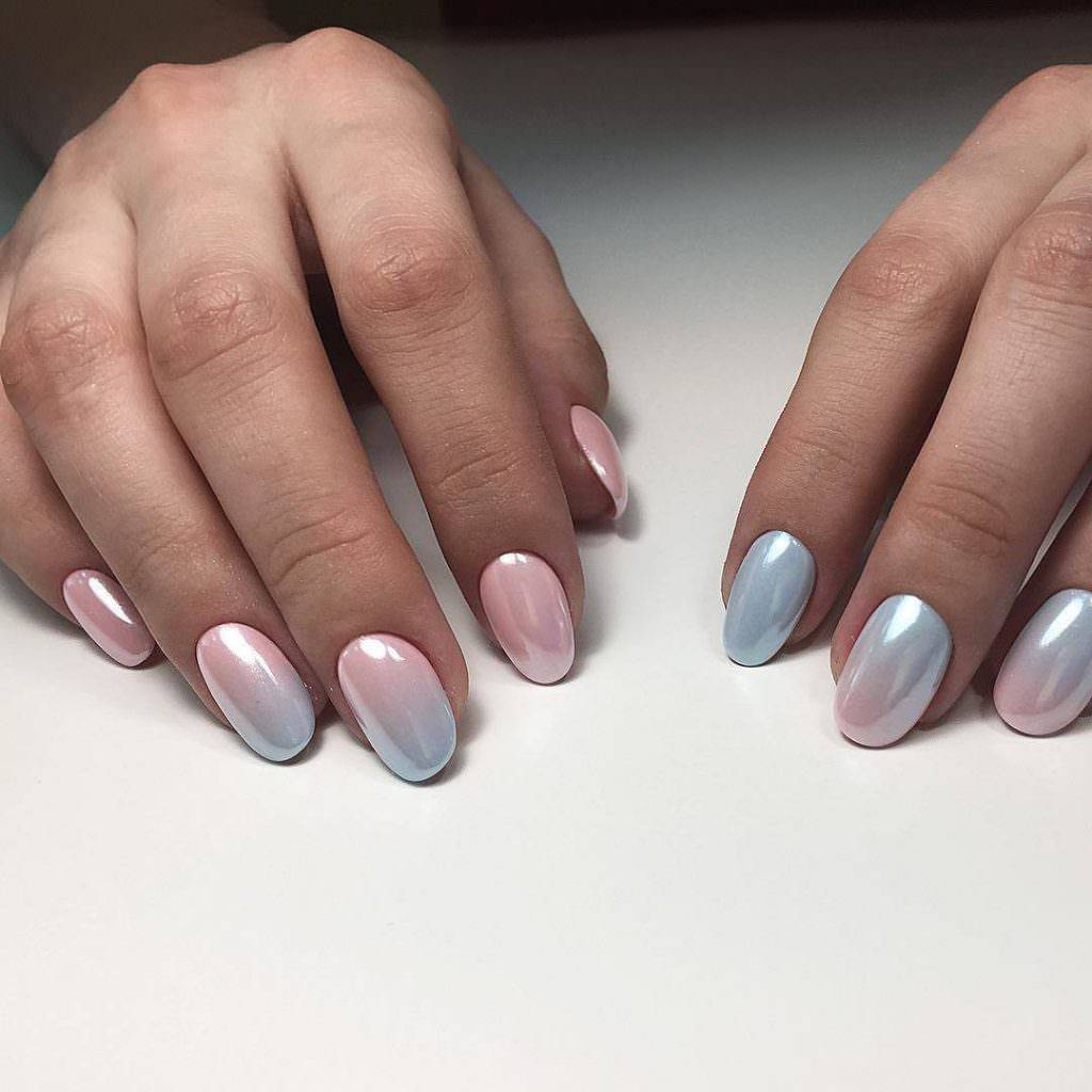 Хотите больше блеска — дополните ногти с градиентом втиркой. Это тонкодисперсная пудра, с которой легко работать. Она может быть прозрачной, жемчужной, голографической и другой. Еще один вариант — втирка кошачий глаз. После нанесения просто поднесите магнит к невысохшему составу и сформируйте диагональную полоску для дополнительного блеска.