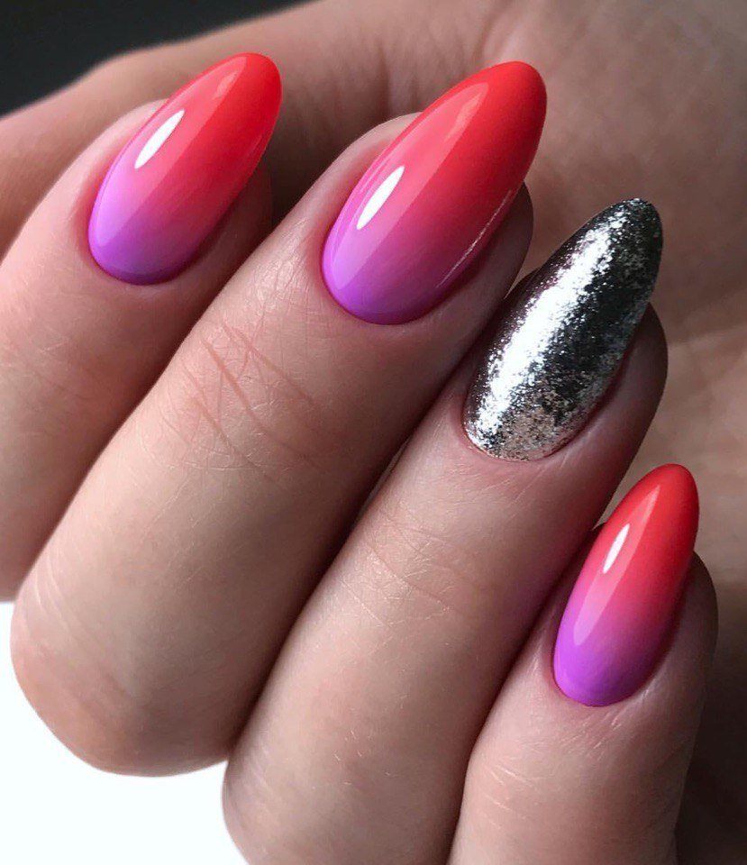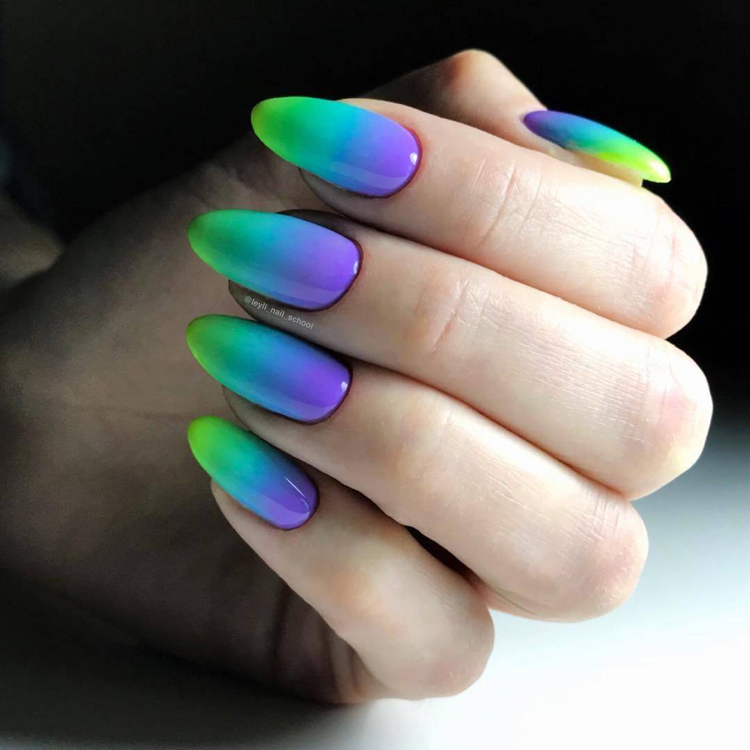 Одинаково красиво смотрятся вертикальный и горизонтальный градиент. В вертикальном градиенте, исходя из названия, цвета сменяются от одного бокового валика к другому вертикально. Существует большое количество вариантов. Например, когда от пальца к пальцу происходит смена цветов градиентных переходов, причем цвет правой половинки последующего ногтя дублирует цвет левой половинки предыдущего.
