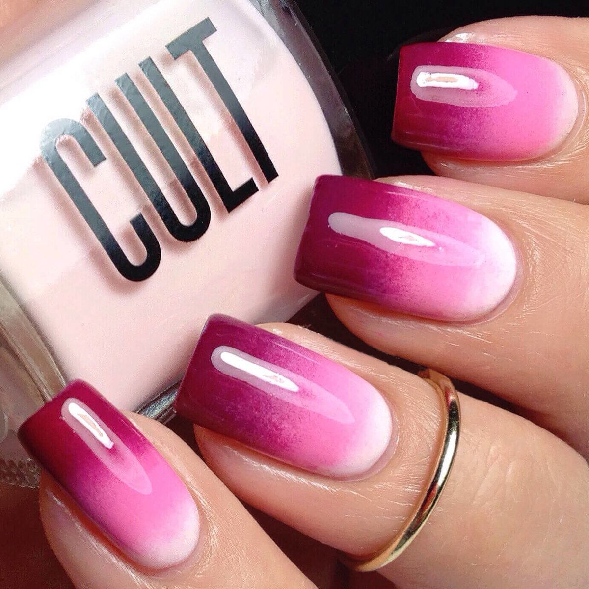 Нежный и женственный вариант омбре. Здесь можно использовать розовый и белый, розовый и другие оттенки палитры. Переход может быть почти невидимым или контрастным. В качестве декора подходит втирка, блестки или рисунки.