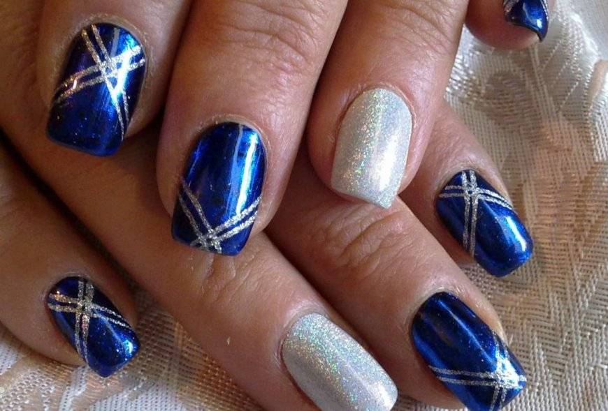 Отличным сочетанием считаются синие ногти, украшенные серебристым дизайном. Органичнее смотрятся именно холодные оттенки синего. Большой популярностью пользуется французский маникюр, где в качестве основы выступает синий, а кончики – серебристые.