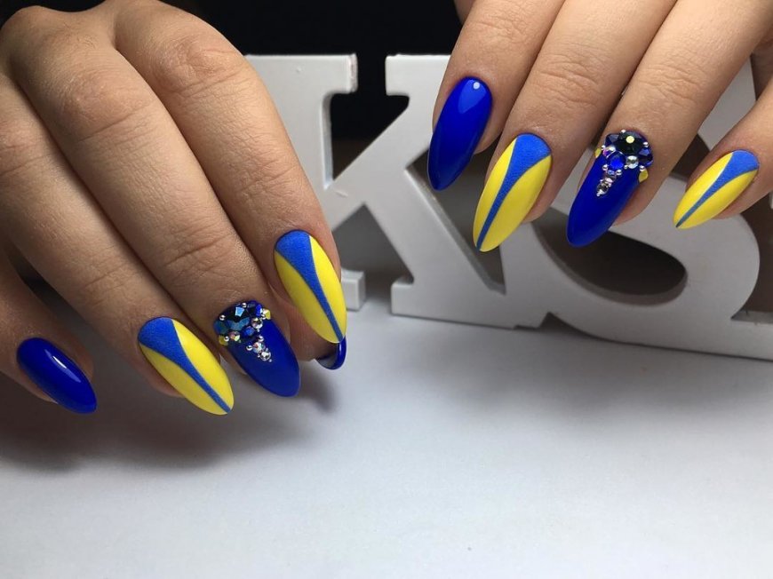 Одно из самых классических сочетаний для коротких и длинных ногтей – желто-синий маникюр. Летнее настроение, яркие оттенки, молодежный дизайн – всё это дарят нотки желтого цвета в композиции. Он является контрастным, и поэтому подчеркивает силу синего.