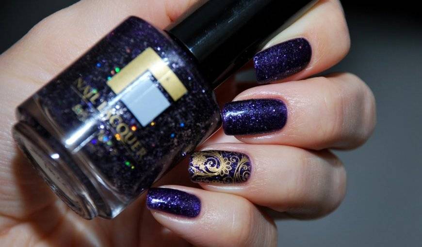 При наличии длинных ногтей, стоит уделить внимание глянцевым тонам синего, которые тоже можно украсить золотыми дизайнерскими элементами
