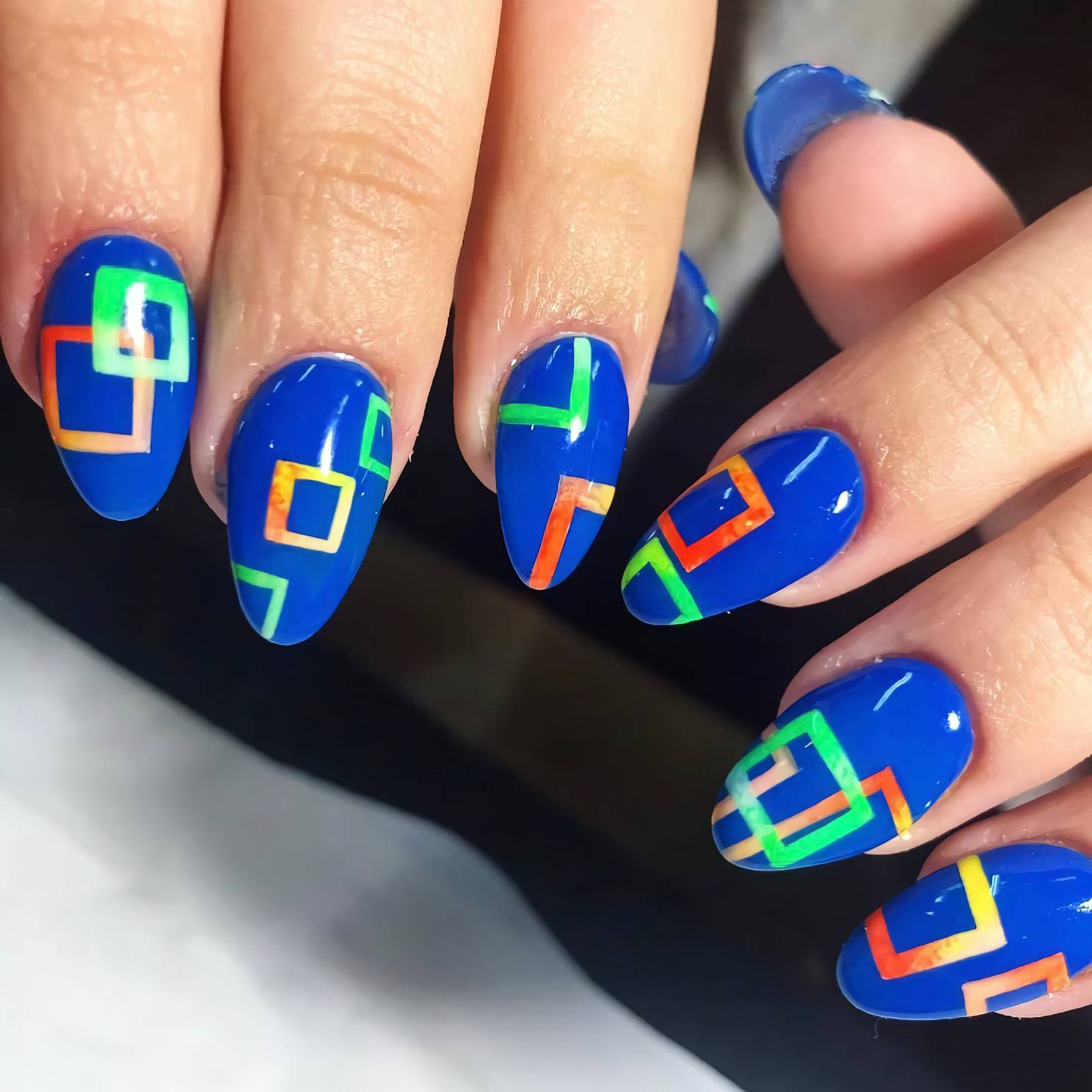 Этот геометрический дизайн ногтей с ярко-синей основой и градиентными акцентами из лайма, желтого и оранжевого оттенков, несомненно, потрясающий. Мы здесь ради этого стиля.